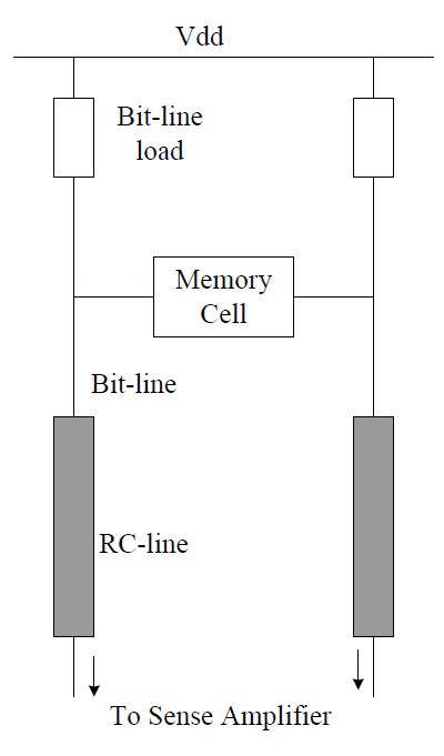 특정 메모리 셀에서 비트를 읽으려면 셀의 행을 따라 워드선을 켜서 해당 행의 모든 셀을 활성화한다. 그런 다음 셀에 저장된 값(논리 0 또는 1)이 연결된 비트 라인으로 전달된다. 두 개의 상호 보완적인 비트 라인 끝에 있는 감지 증폭기는 작은 전압을 일반적인 논리 레벨로 증폭한다. 원하는 셀의 비트는 셀의 감지 증폭기에서 버퍼로 래치된 다음 출력 버스에 배치된다.[5]