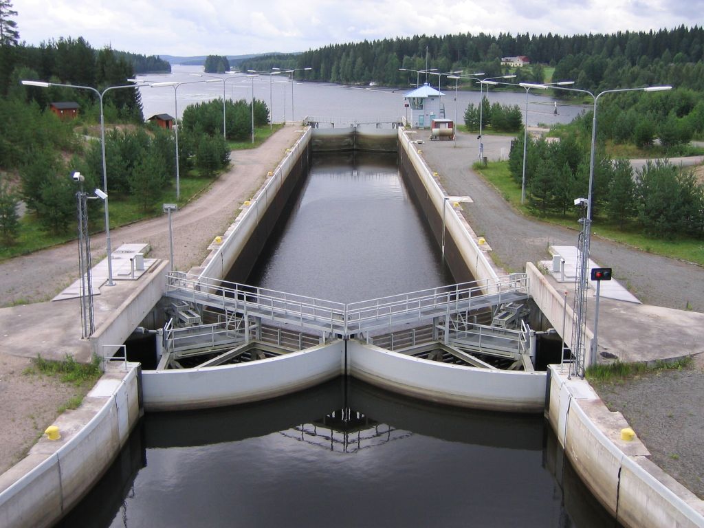 - 상류와 하류 운하를 연결하고 하나 이상의 보트를 수용할 수 있을 만큼 큰 방수 ''갑문실''. 갑문실의 위치는 고정되어 있지만 수위는 변동될 수 있다.