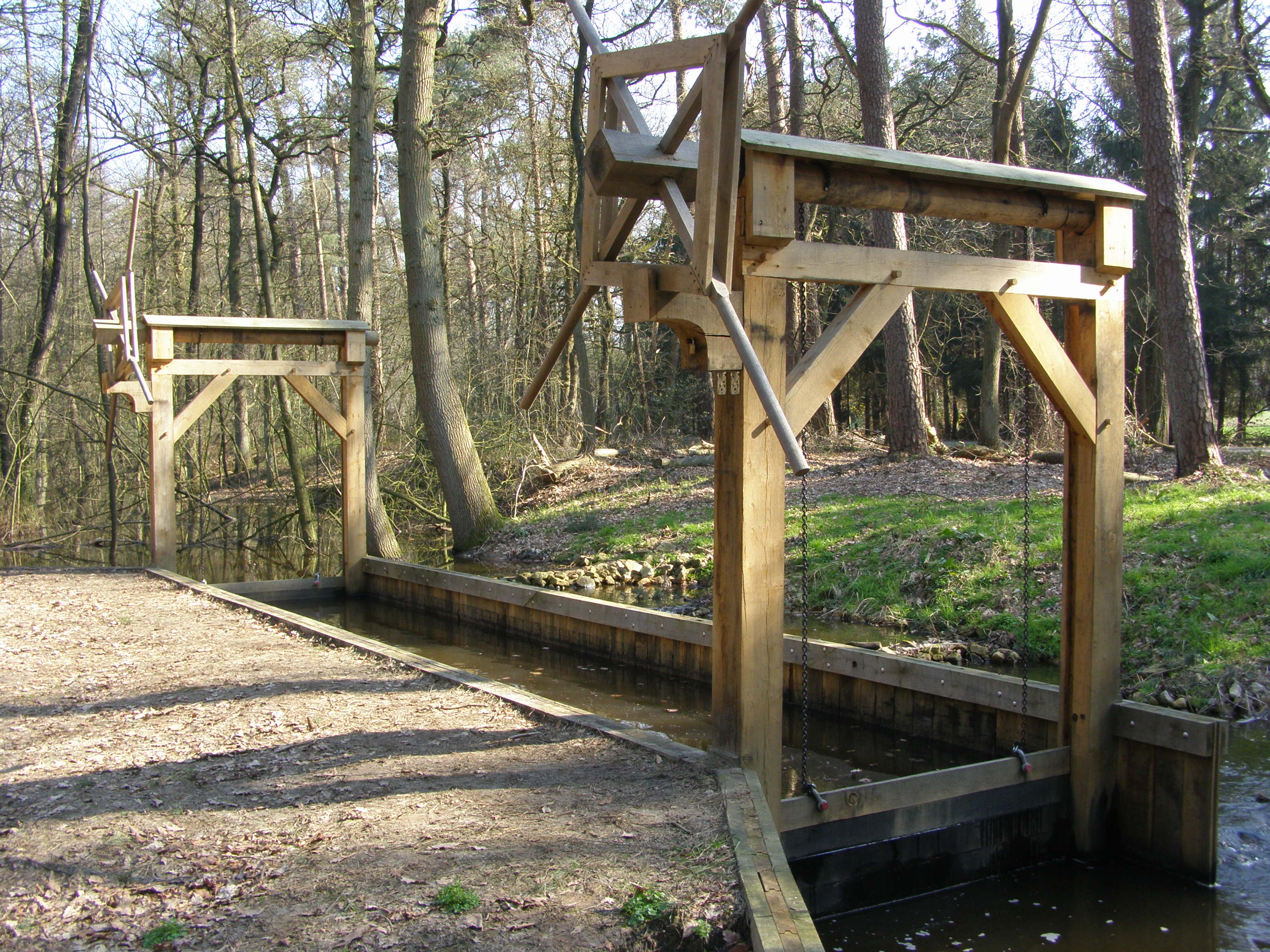 - 필요에 따라 갑문실을 비우거나 채우는 ''갑문 장치'' 세트. 이는 일반적으로 (전통적으로, 수동으로 랙 앤 피니언 메커니즘을 감아 올린 평판(패들)) 갑문실 안팎으로 물이 배수되도록 하는 간단한 밸브이다.[11] 더 큰 갑문은 펌프를 사용할 수 있다.