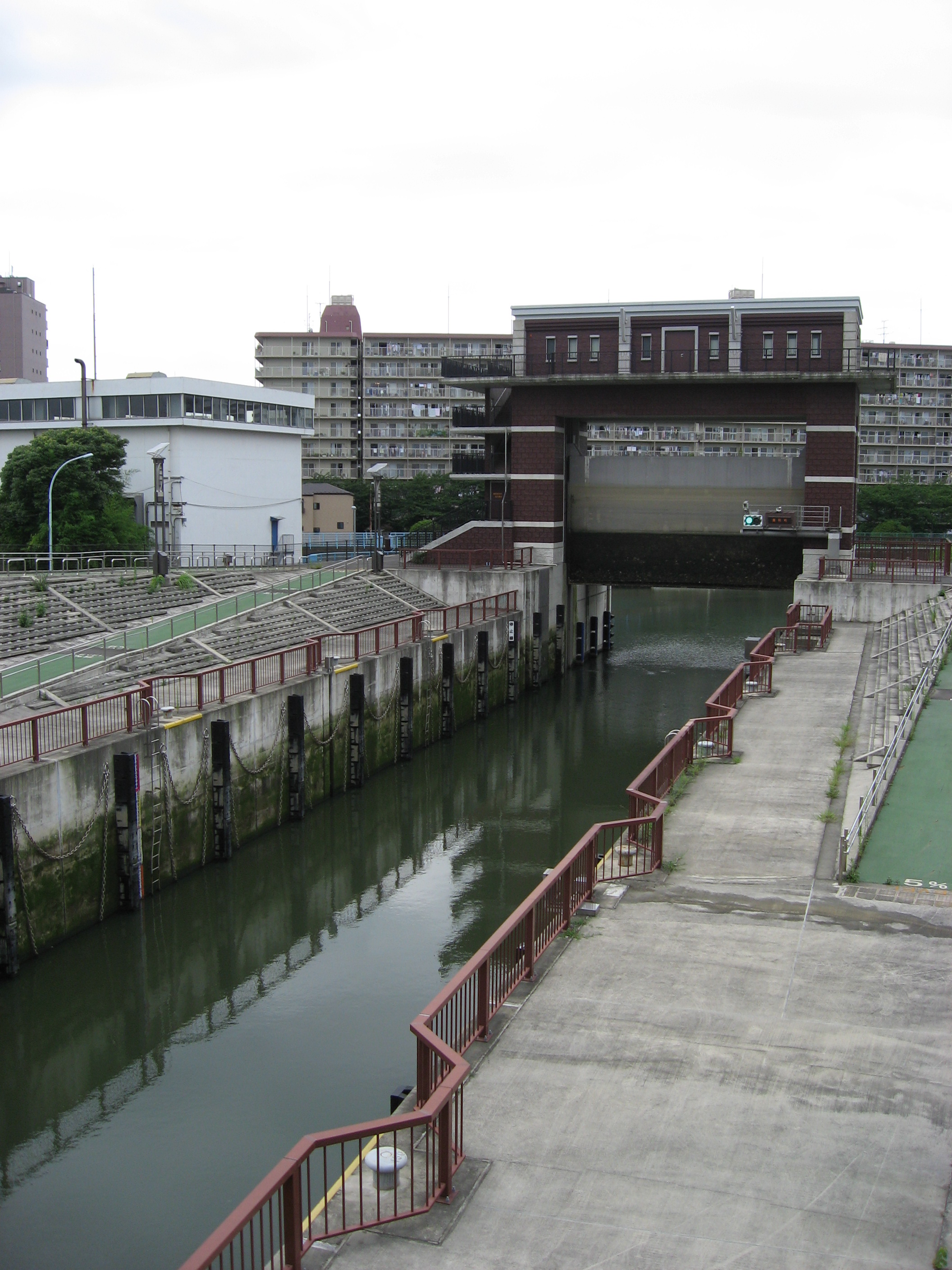 - '''단일 닫이실 갑문'''은 닫이실이 갑실의 한쪽에 1개만 있으며, 갑실 내부가 독으로 되어 있다.[100] 조석에 의한 수위 차이의 영향을 받지 않고 선박의 화물 취급 등을 할 수 있도록 바다나 하구 부근의 항구에 설치된다.