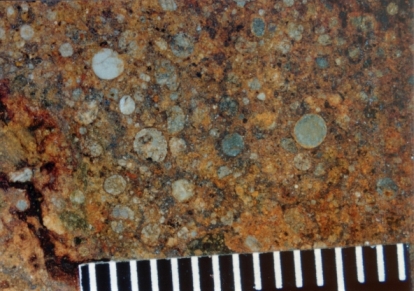 콘드룰이 있는 콘드라이트 운석. 밀리미터 크기 눈금이 표시되어 있다.