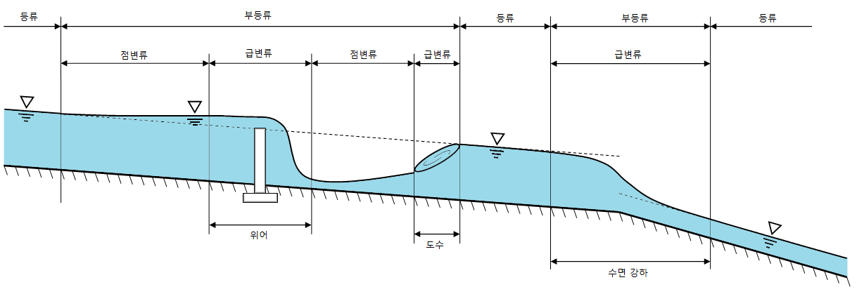 | 등류 | 수심, 유속, 단면의 크기가 일정한 흐름 |
