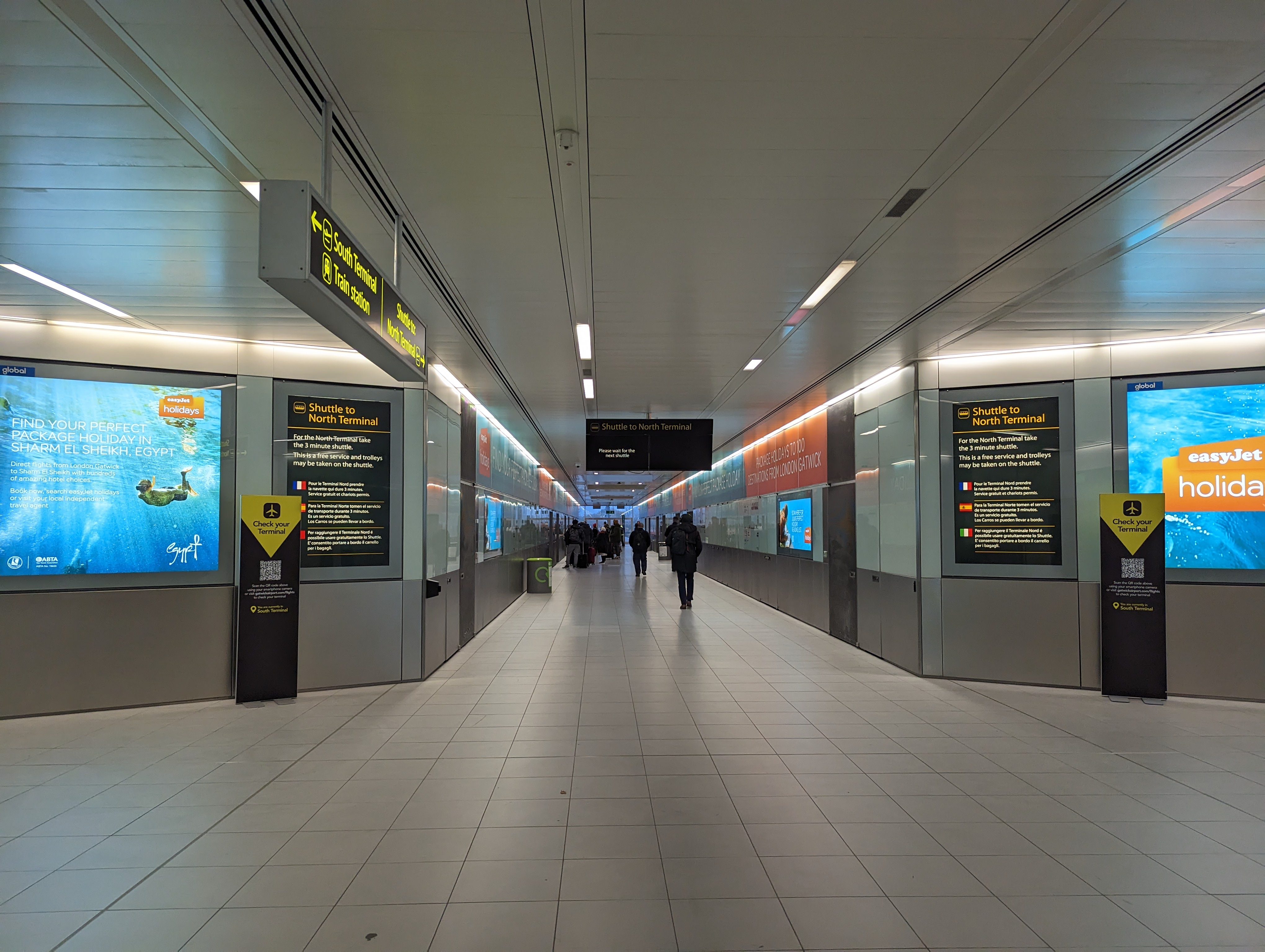 개트윅 공항에는 남 터미널과 북 터미널 두 개의 터미널이 있다.[329] 남 터미널은 98,000제곱미터, 북 터미널은 160,000제곱미터 규모이다.[329] 개트윅 공항역은 남 터미널과 바로 연결되어 있으며, 북 터미널은 자동 운전 신교통 시스템인 개트윅 공항 트랜짓으로 연결된다. 두 터미널 모두 상점, 레스토랑, 다종교 기도실, 상담실 등 다양한 편의 시설을 갖추고 있다.[42] 각 터미널에는 성공회, 가톨릭, 자유 교회 사제가 있으며, 매일 예배가 진행된다.[42]