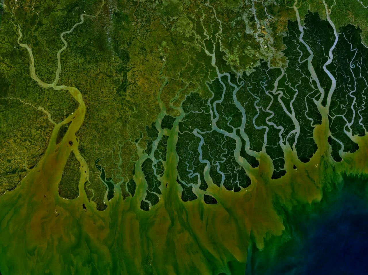 갠지스 삼각주는 주로 갠지스 강과 브라마푸트라 강의 크고 퇴적물이 많은 흐름에 의해 형성되며, 약 64000 km2로 세계에서 가장 큰 삼각주이다. 벵골 만을 따라 400km 뻗어 있다.
