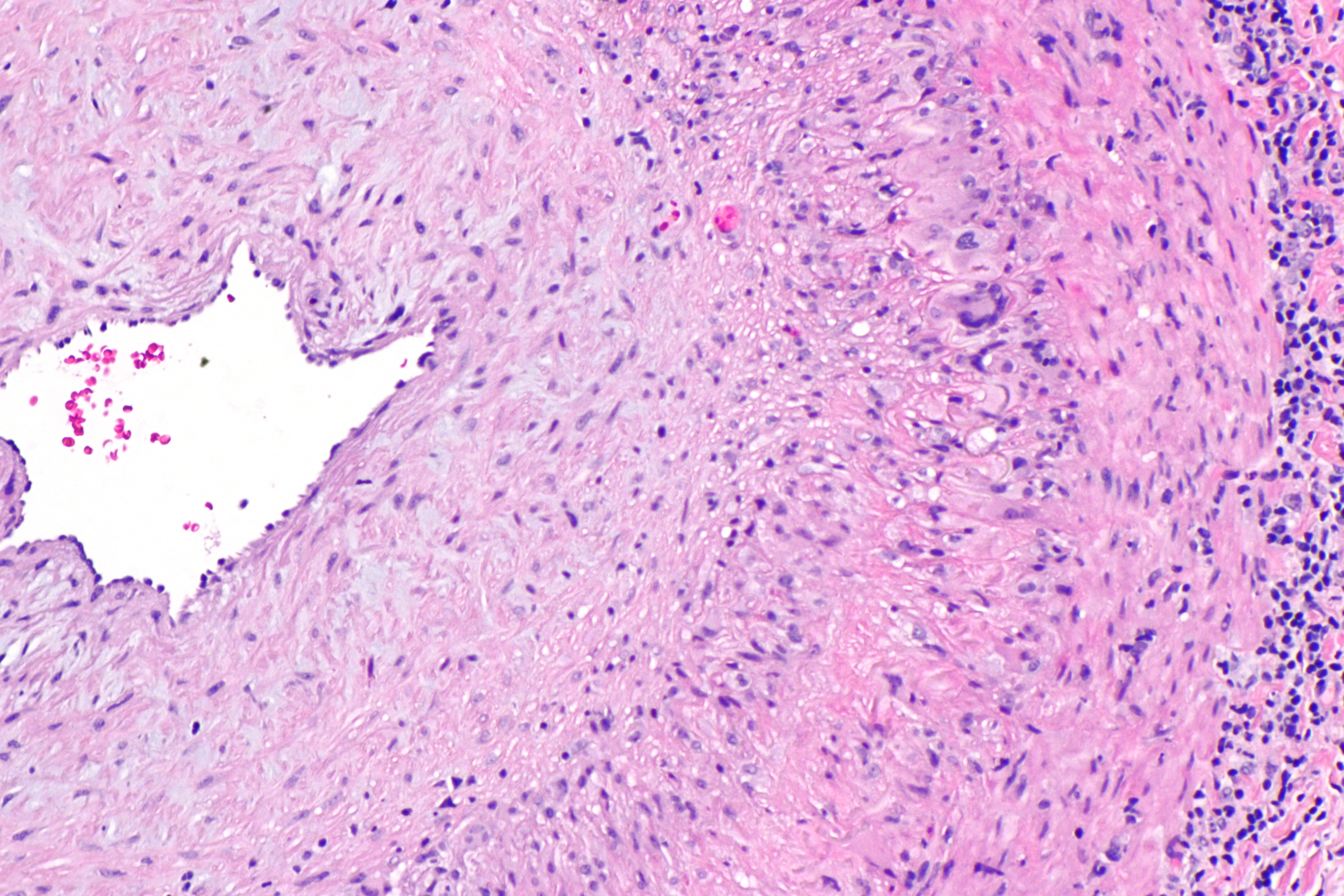 생검 조직에서는 혈관 중간층의 육아종염증, 내막 증식, 탄성판 파편화, 그리고 CD4 양성 T세포 침윤 등이 특징적으로 관찰된다. 이러한 병리학적 소견은 임상적 진단이나 다른 진단 기준들을 확증하는 데 중요한 역할을 한다.[11]