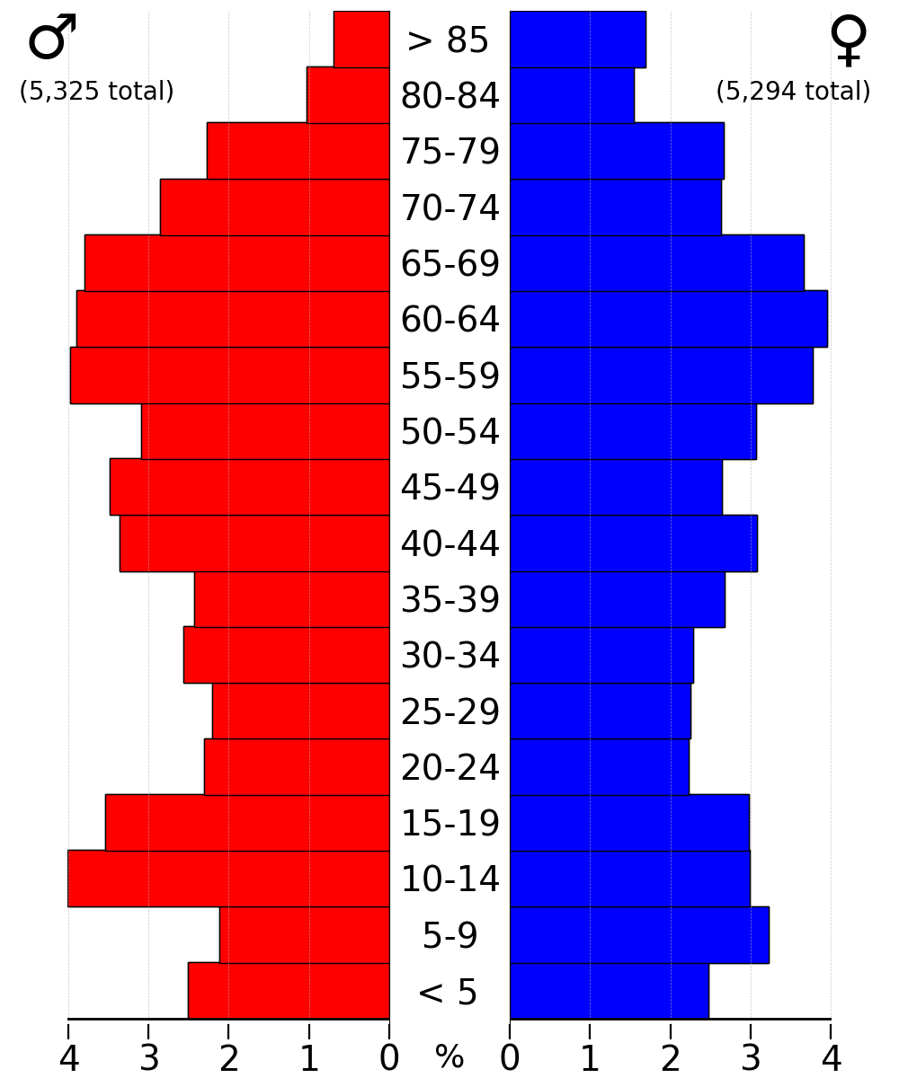 연령 분포는 18세 미만 23.60%, 18~24세 6.30%, 25~44세 24.80%, 45~64세 24.90%, 65세 이상 20.50%였다. 중간 연령은 42세였다. 여성 100명당 남성은 97.60명이었다. 18세 이상 여성 100명당 남성은 94.30명이었다.
