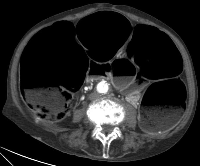 거짓 장폐색증(IPO)을 앓고 있는 노년 여성의 복부 CT 스캔 (단면)