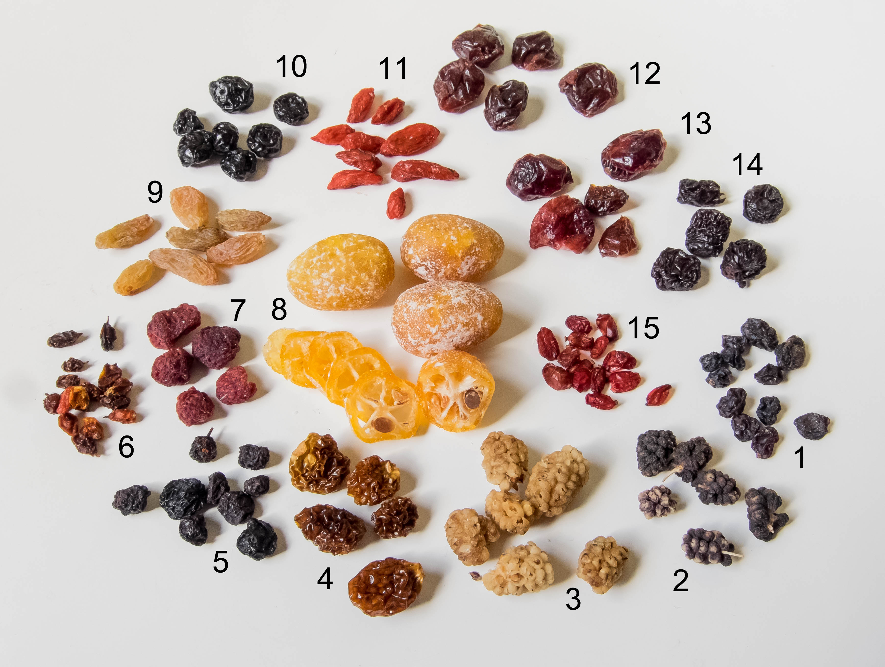 건조 과일은 매우 다양한 종류의 과일로 만들어진다. 포도를 말린 건포도, 감을 말린 곶감처럼 널리 알려진 것 외에도 여러 종류가 있다. 아래는 다양한 건조 과일의 예시이다.
