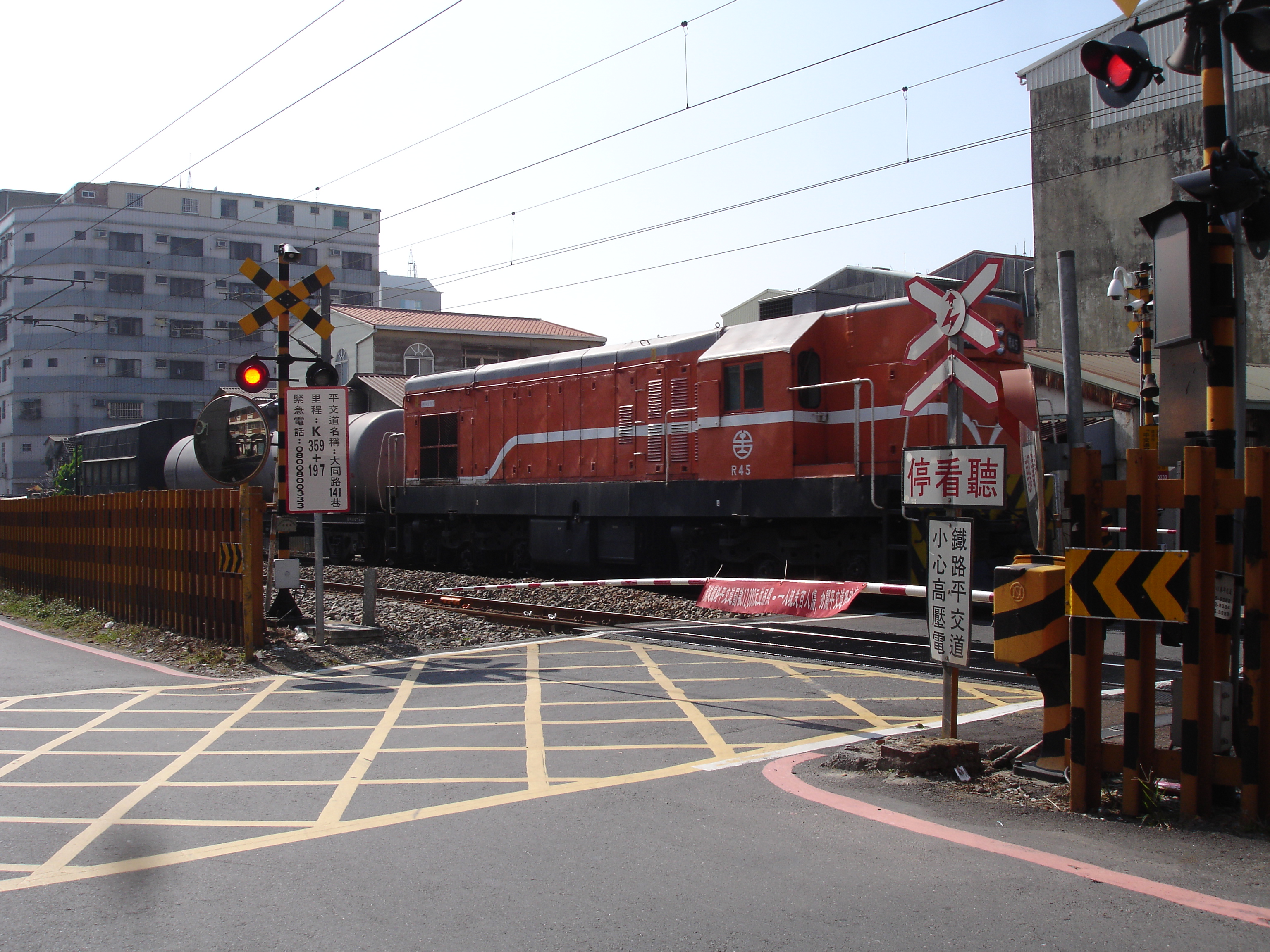 - 타이완의 철도 건널목은 자동 차단기와 건널목 관리원이 조작하는 차단기가 혼재되어 있다. 타이완 철로 관리국의 건널목은 2017년 기준 435곳이며,[64] 3종류로 나뉜다. 제1종은 자동 경보기와 차단기 또는 보안 요원이 있는 곳, 제2종은 일부 시간에만 보안 요원이 차단기를 조작하는 곳, 제3종 가는 자동 경보기와 차단기가 있는 곳이다. 타이완 국철은 일본 통치 시대 타이완 총독부 철도의 제도를 준용하며, 경보기는 황색과 흑색, 차단기는 백색과 적색 줄무늬를 사용한다.