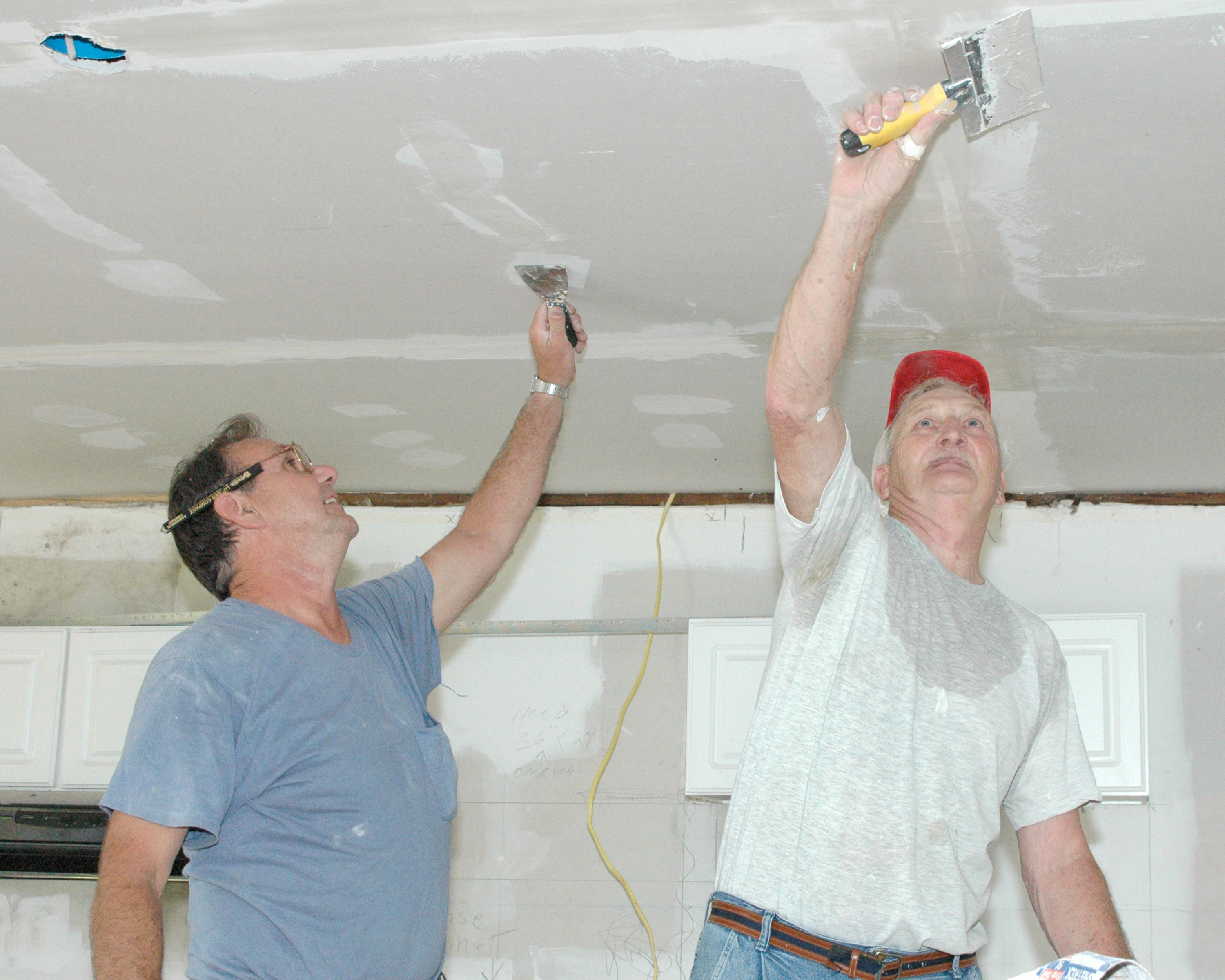 시트가 벽 스터드 또는 천장 장선에 고정된 후 설치자는 조인트 테이프 또는 섬유 메쉬로 석고보드 시트 사이의 이음새를 가린다. 때로는 머드라고도 하는 조인트 컴파운드 층은 일반적으로 석고보드 흙손 또는 칼로 도포된다. 이 컴파운드는 또한 모든 나사 구멍 또는 결함에 적용된다. 컴파운드는 공기 건조되도록 한 다음 일반적으로 페인트를 칠하기 전에 매끄럽게 샌딩한다.[16] 또는 더 나은 마감을 위해 전체 벽에 스킴 코트, 즉 얇은 층(약 1mm)의 마감 컴파운드를 칠하여 페인팅 후 종이와 머드 처리된 영역 간의 시각적 차이를 최소화할 수 있다.
