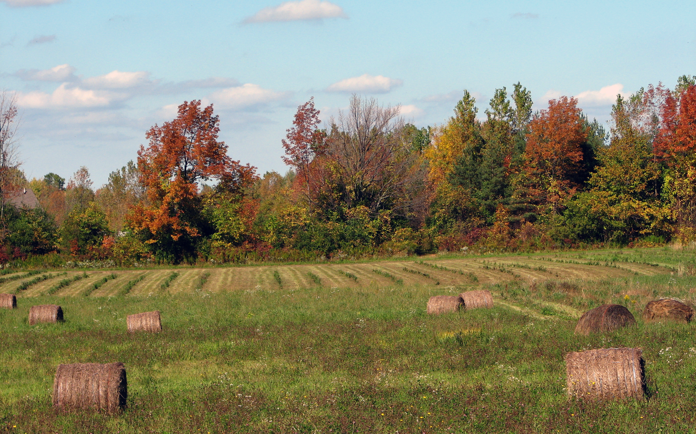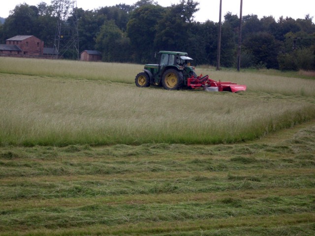 |thumb|절단된 건초가 앞에 놓인, 건초밭을 깎는 트랙터 | |thumb|갓 압연된 건초 묶음을 쏟아내는 원형 묶음기 | |thumb|현대적 소규모 운송. "대형 사각형" 묶음이 실린 픽업 트럭 |