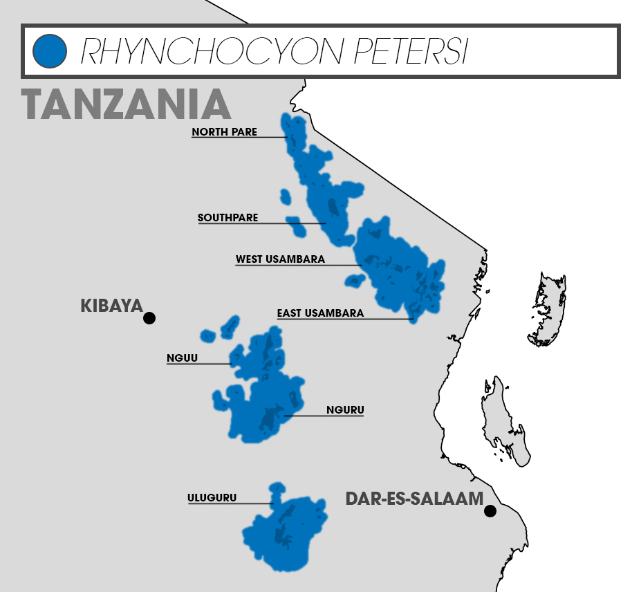 탄자니아 동부 아크 산맥에 서식하는 ''Rhynchocyon petersi''의 분포. 이 종은 일반적으로 산맥 내의 작고 단편화된 숲 조각(짙은 파란색)에 제한되어 있다(파란색).