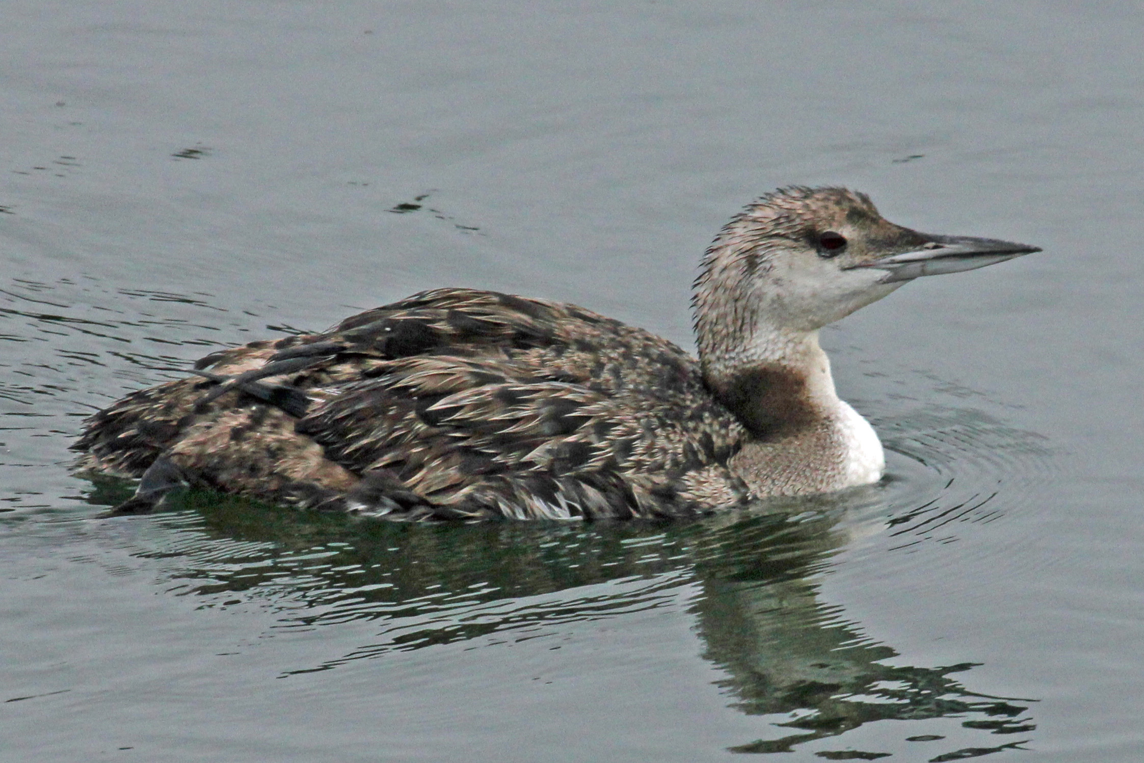비번식기 성체의 깃털은 어두운 목과 머리에 어두운 회색 갈색이 있는 갈색을 띤다.[14][20] 눈은 흰색으로 둘러싸여 있고[14], 눈꺼풀은 옅다.[20] 부리는 대부분 옅은 회색이며, 어두운 용골과 끝을 가지고 있지만, 이른 봄에는 끝이 흰색으로 변할 수 있다. 아랫부분, 얼굴 아래, 턱, 목구멍도 흰색을 띤다. 앞목은 흰색이며, 일반적으로 어두운 목 측면에 쐐기 모양의 홈을 형성하고,[14] 때로는 목 고리의 희미한 흔적이나 옅은 칼라를 드러낼 수 있다.[20] 어깨에 사각형의 불분명한 패턴과 흰색 반점이 있는 날개 덮깃이 있는 어두운 갈색 회색 등 부분을 가지고 있으며, 이는 일반적으로 수영하는 동안 가려진다. 수컷과 암컷은 외형이 비슷하지만,[14] 수컷이 암컷보다 크고 상당히 무거운 신체적 특징에서 성적 이형성을 보인다.[56]