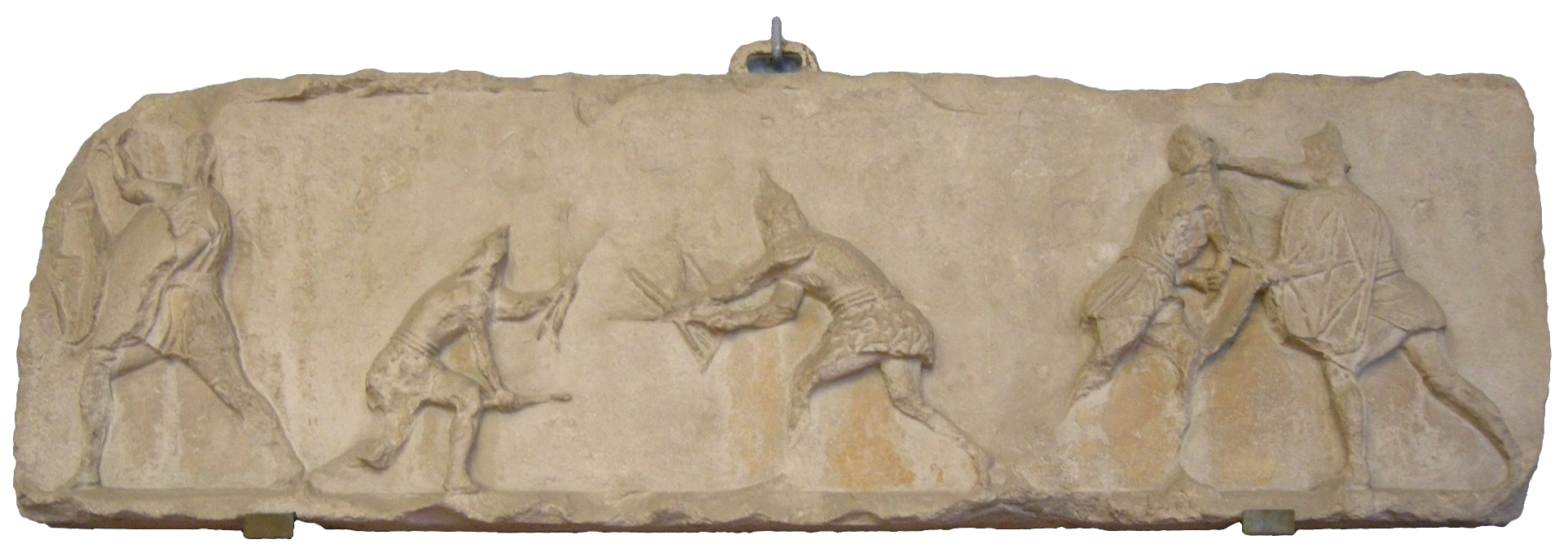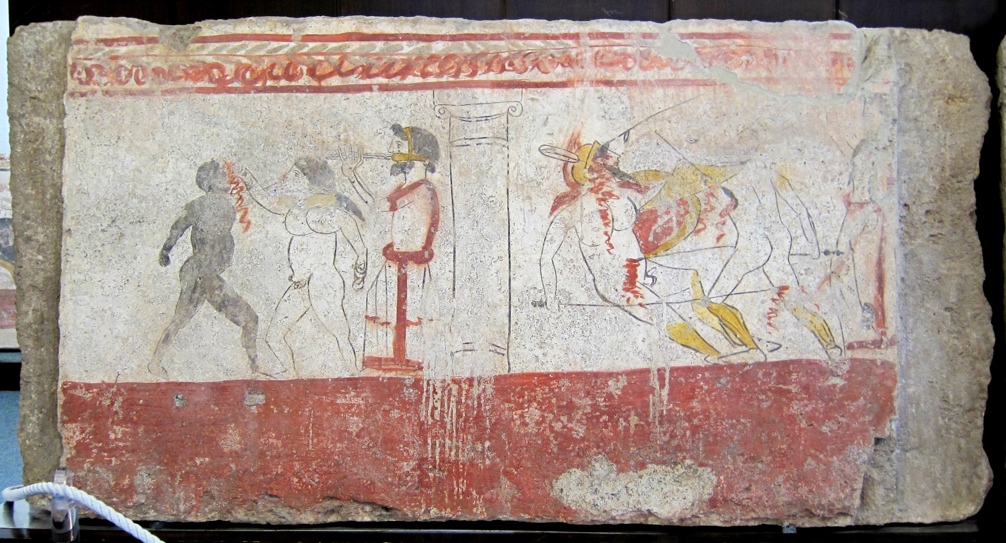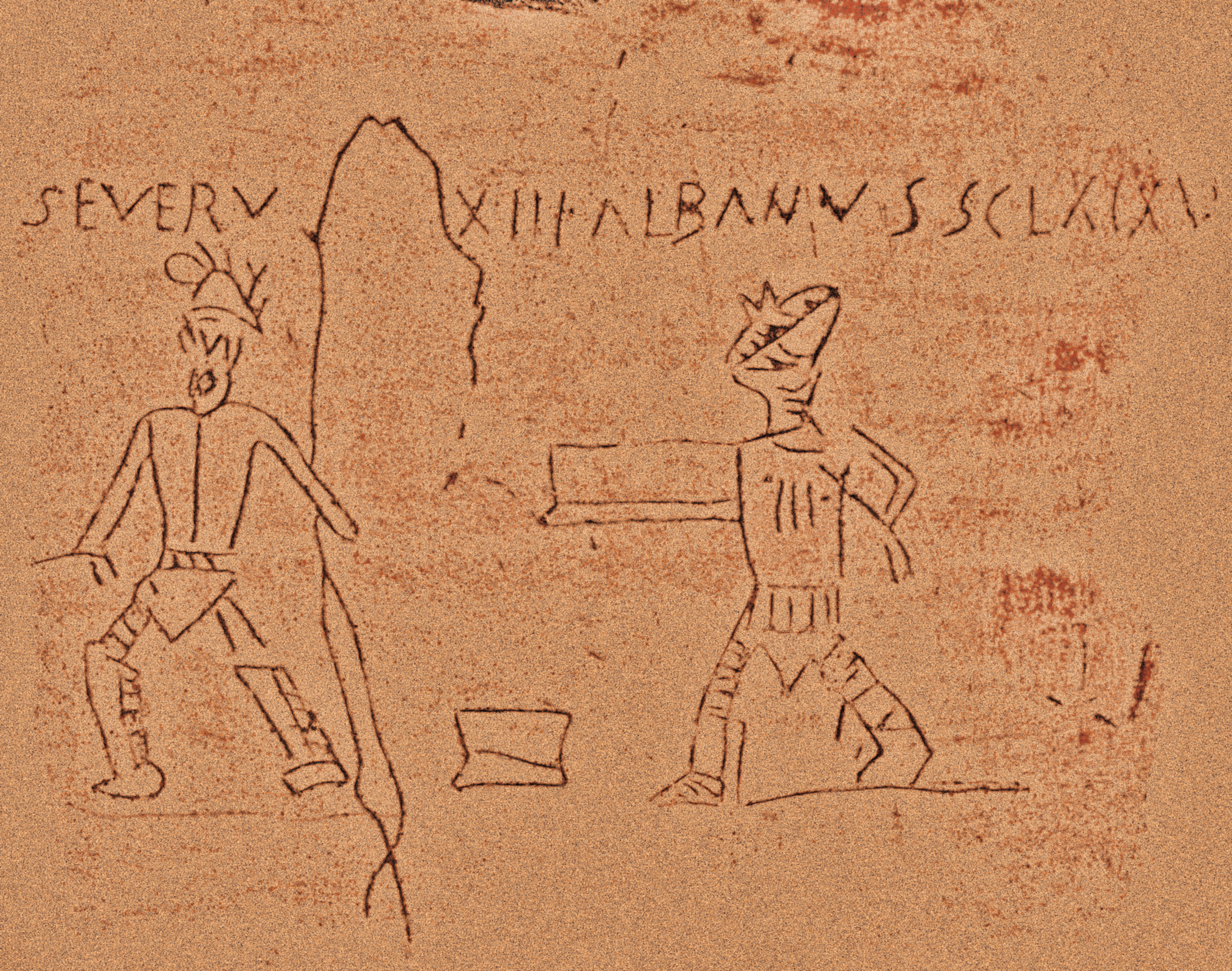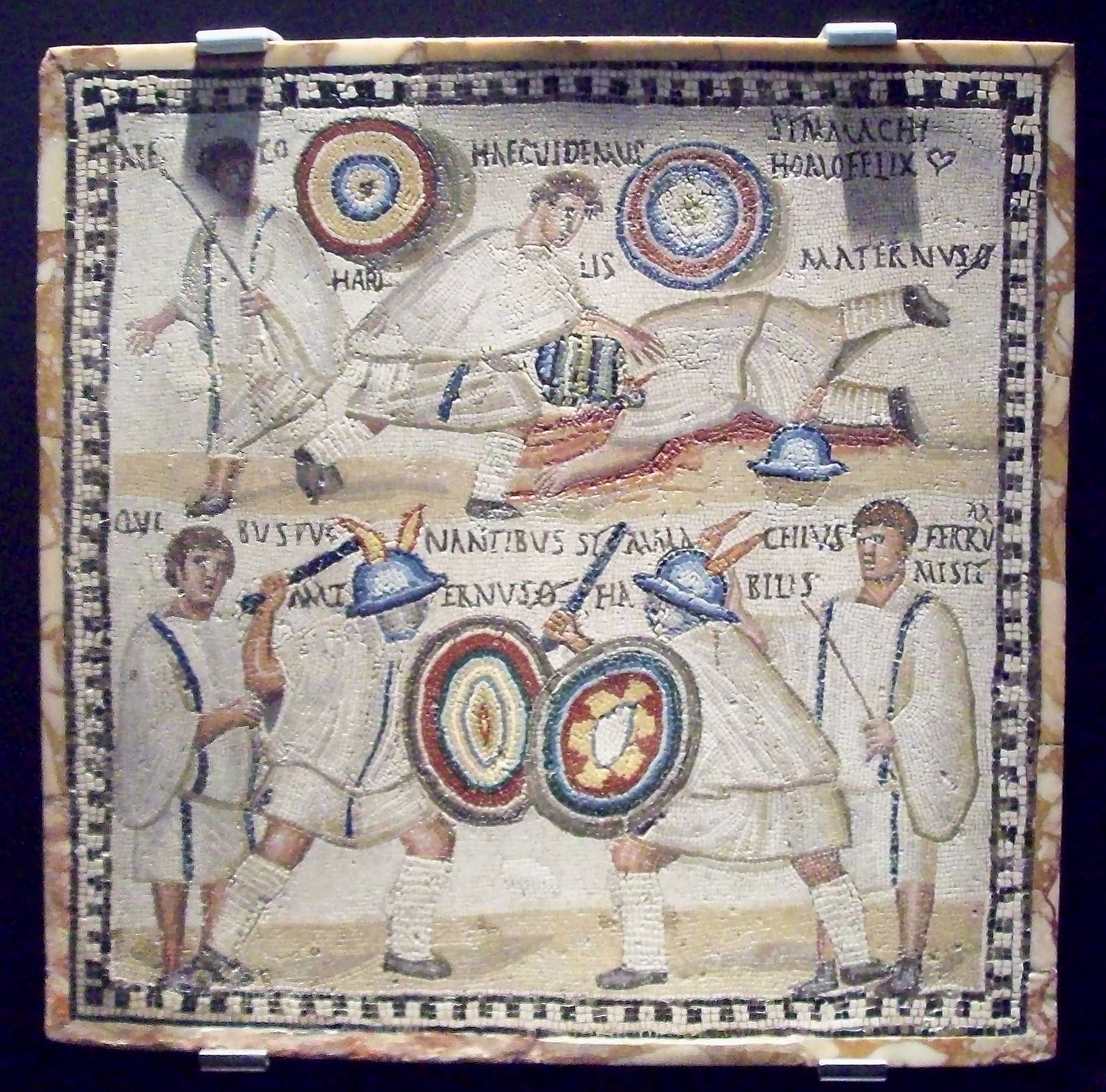 검투사의 기원에 대해서는 여러 설이 있지만, 에트루리아인의 제물 의식에서 유래했다는 설은 현재 지지받지 않는다.[251] 기원전 4세기 캄파니아 지방 파에스툼(Paestum)의 무덤 벽화에 투사 시합 모습이 그려져 있어, 캄파니아 기원설이 제기된다.[252] 역사가 리비우스는 캄파니아인들이 삼니움인 포로를 투사로 싸우게 했다고 기록했다.[253] 기원전 1세기경 남부 이탈리아는 투사가 가장 성행했던 지역이었다.[254]