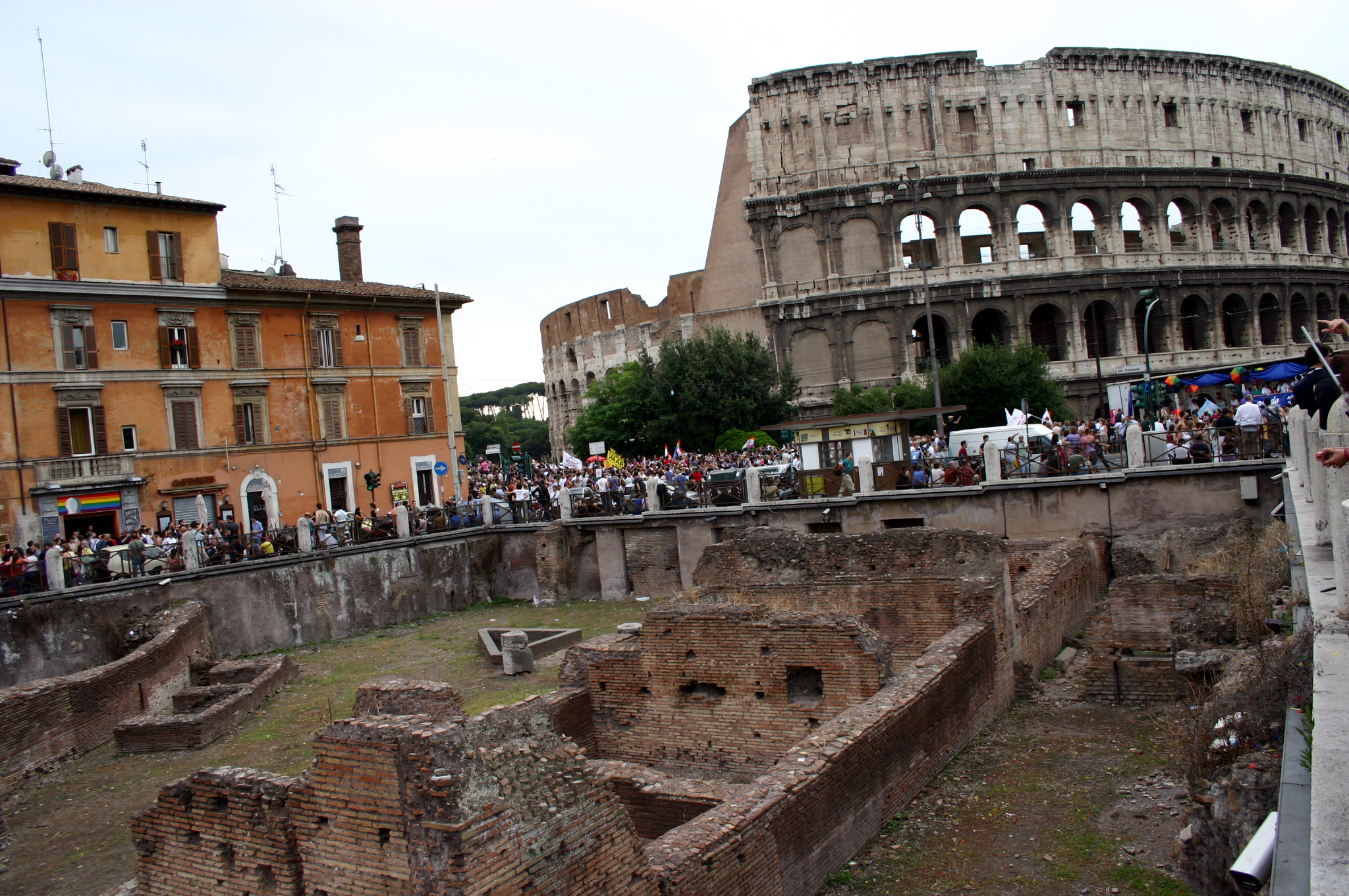 경기의 인기가 높아짐에 따라 전용 경기 시설인 원형 경기장이 건설되었다. 초기에는 로마 포룸과 같은 개방된 공간에 임시 좌석을 설치하여 경기를 진행했으나[187], 기원전 70년경 폼페이에 최초의 석조 원형 경기장이 세워졌고[191], 로마 시내에도 목조 및 부분 석조 경기장을 거쳐 마침내 콜로세움(플라비우스 원형 극장)이 건설되었다. 베스파시아누스 황제 때 착공하여 서기 80년 티투스 황제 때 완공된 콜로세움은 약 5만 명을 수용할 수 있는 거대한 건축물로, 제국 전역에 건설된 수많은 원형 경기장의 모델이 되었다.[194] 원형 경기장은 단순한 경기장을 넘어, 황제나 관료들이 대중과 소통하고 여론을 파악하며, 때로는 사회 질서를 유지하는 공간으로 기능했다.[195][196][197] 아우구스투스는 원형 경기장의 좌석을 신분별로 엄격히 구분하는 규정을 만들기도 했다.[198]