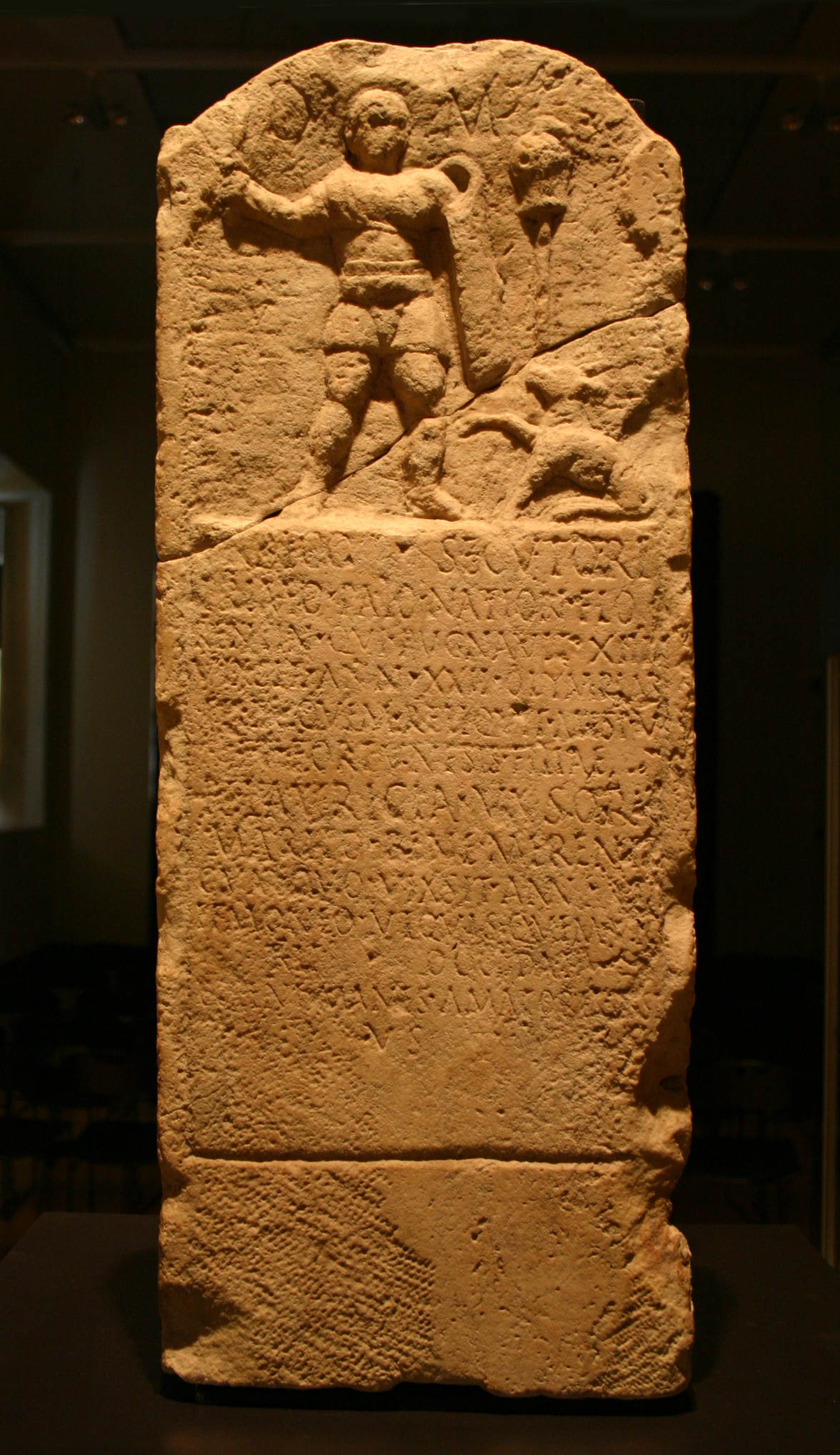 -- -- | ![]() 추격 검투사는 그물에 걸리면서도 싸우고(아래), 망투사가 패배하여 단검을 내밀고, 패배를 인정했다(위). Kalendio의 이름 뒤에 죽음을 의미하는 θ(세타)의 문자가 있는 것으로 보아 그는 처형된 것으로 보인다. |