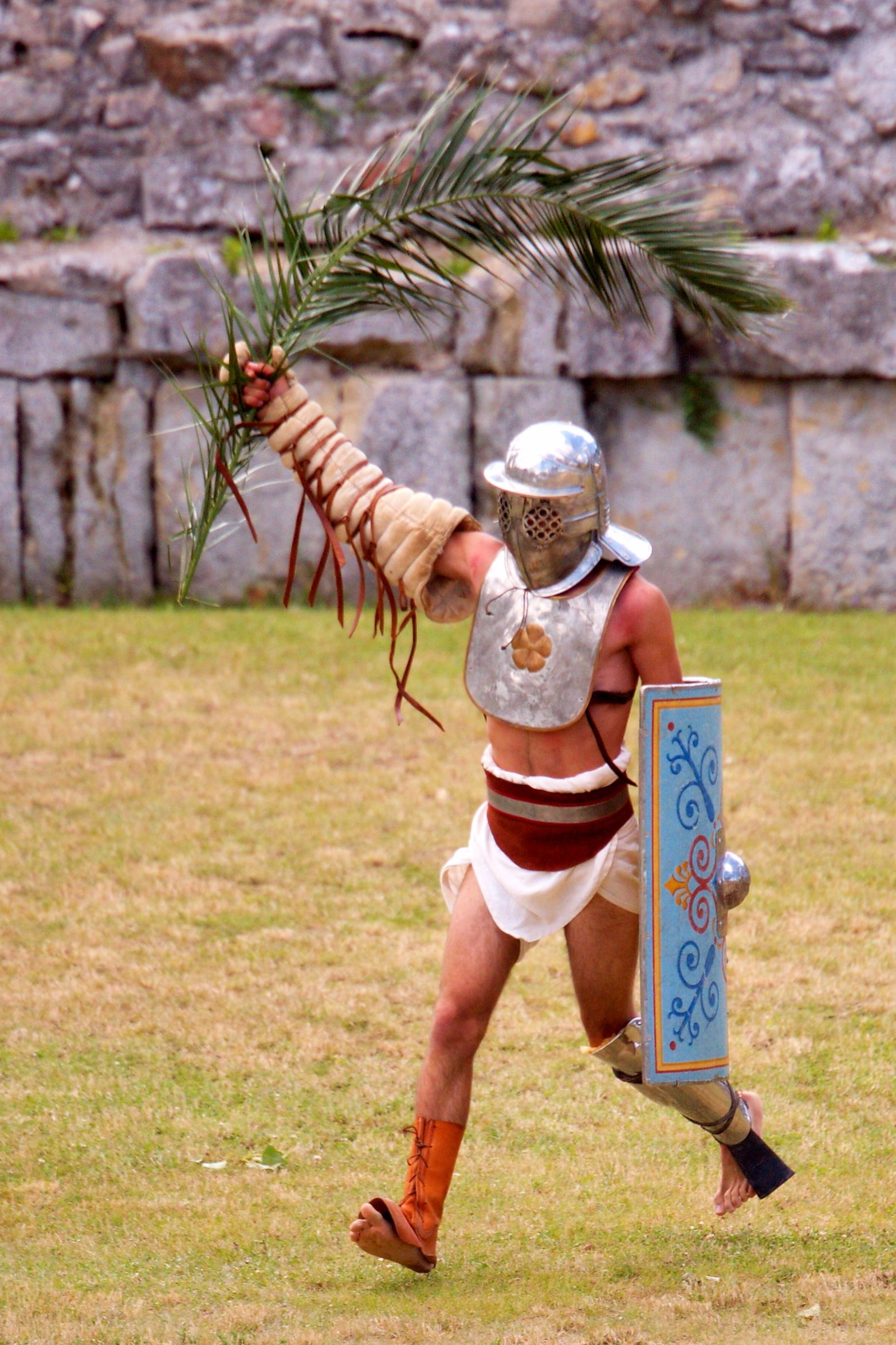 검투사의 정확한 기원은 불분명하지만, 에트루리아인의 장례 의식에서 유래했다는 설은 현재 지지받지 못하며,[251] 기원전 4세기 남부 이탈리아 캄파니아 지방의 장례 풍습과 관련이 있다는 설이 유력하다.[252][253] 로마에서 기록된 가장 오래된 검투 시합은 기원전 264년, 마르쿠스 유니우스 브루투스와 데키무스 형제가 아버지의 장례식에서 거행한 것이다.[255] 초기에는 이처럼 고인의 명복을 비는 장례 의식의 일부인 '무누스(munus)'로 시작되었으나,[257] 점차 그 규모가 커지고 오락적 성격이 강해졌다.