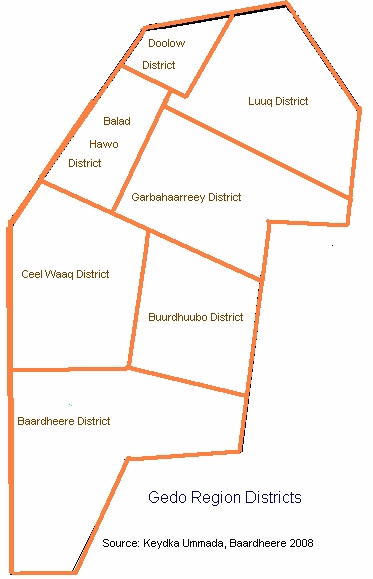 - 루크: 과거 게도 지역의 주요 정치 중심지였으나, 소말리아 내전으로 많은 주민이 다른 지역으로 피난하면서 그 중요성이 다소 감소했다.