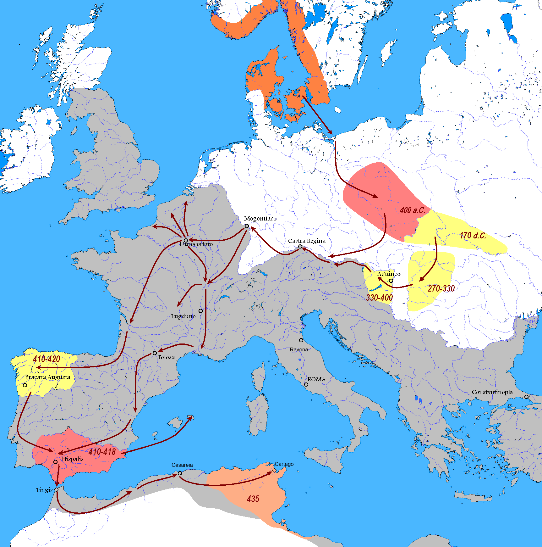 409년 10월, 반달족은 피레네 산맥을 넘어 히스파니아(스페인)에 들어왔다.[6] 서고트족에 의해 갈리아에서 쫓겨난 것이다. 로마는 반달족에게 비옥도가 낮은 이베리아 반도로 이주할 것을 요구했다. 이베리아 반도는 로마 제국이 반달족과 다른 부족들에게 건국을 허락한 땅이었다.[6]