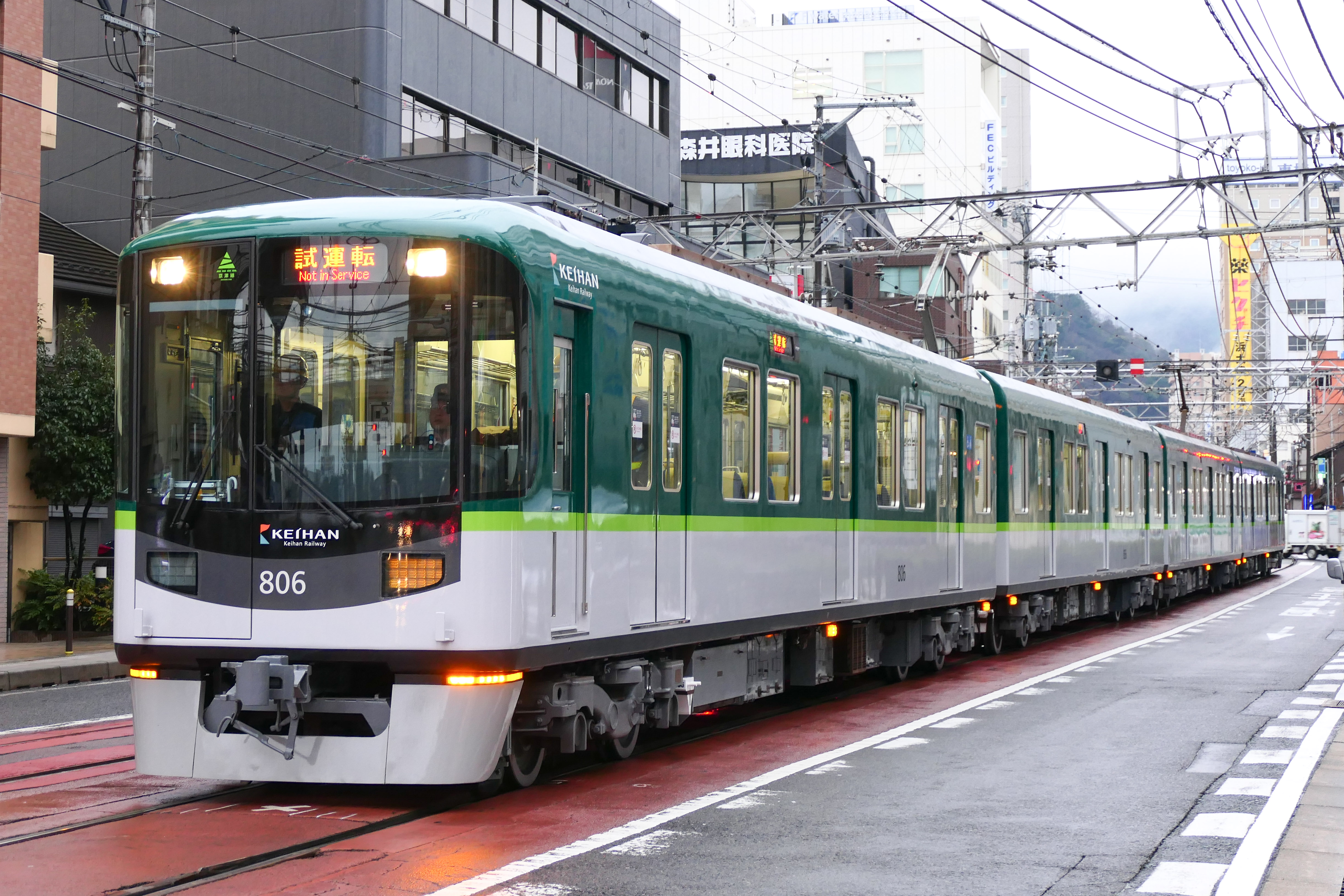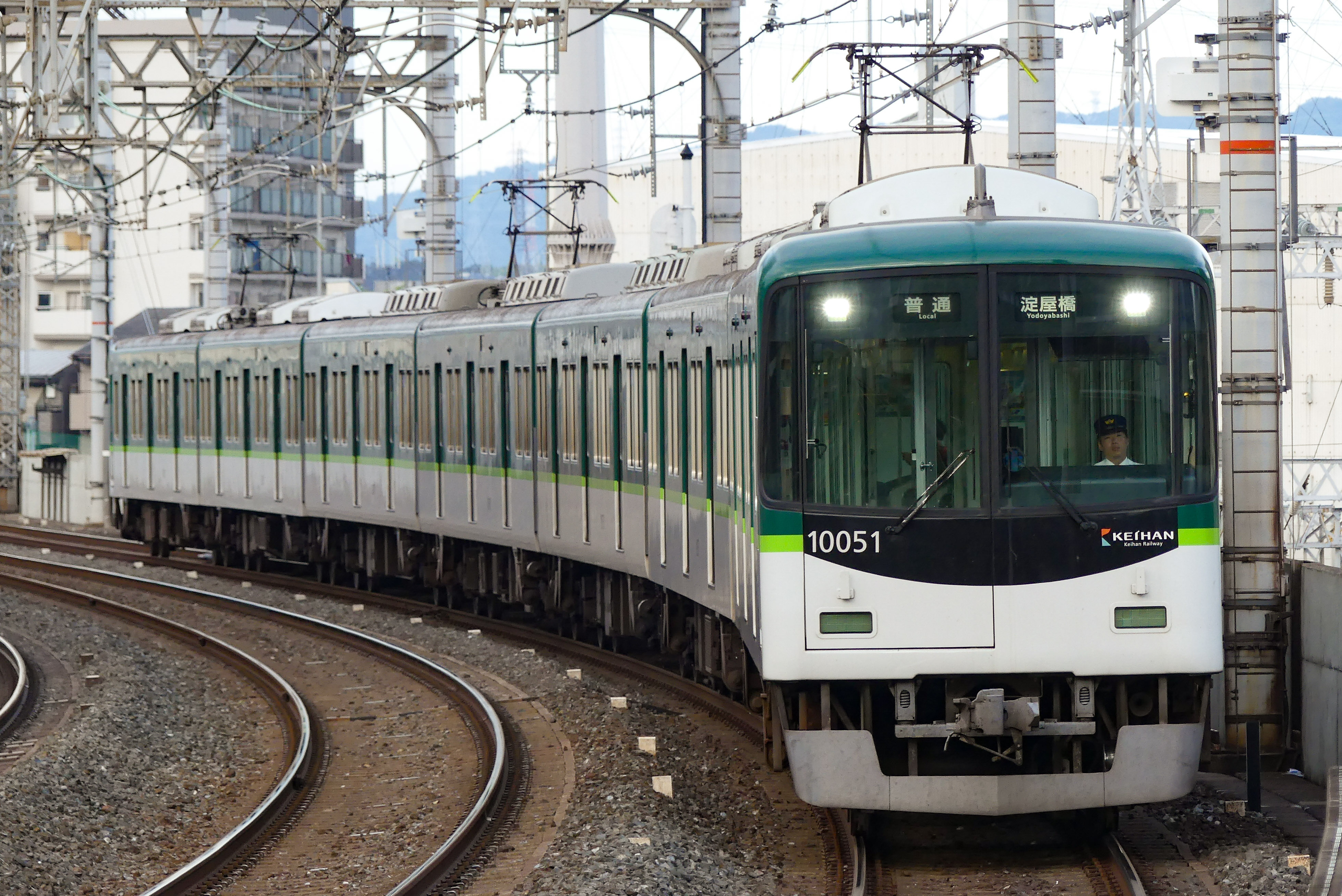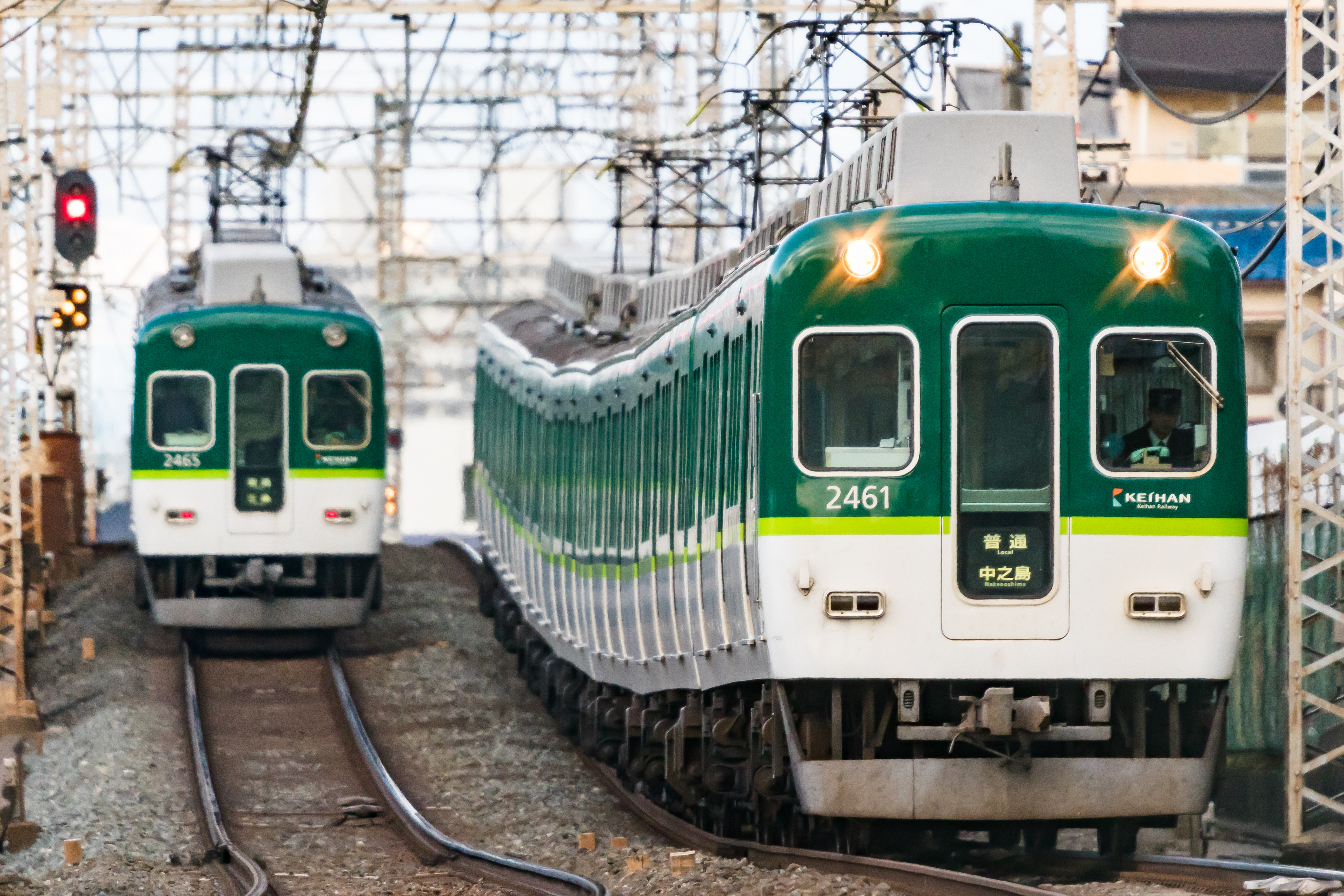 열차 편성은 경한 본선·나카노시마선·가모토선에서는 8량, 7량, 6량이 혼재한다. 우지선·교노선·게이신선은 4량, 이시야마사카선은 2량으로 통일되어 있다. 경한 본선의 나카가시마역~시치죠역 간에는 승강장 유효장이 7량분밖에 없어 8량 편성의 여객 취급이 불가능한 역이 있으며, 일반차 8량 편성 차량에는 식별을 위해 운전대 창문의 진행 방향 오른쪽에 녹색 바탕에 흰색 글씨의 「8」스티커가 붙어 있다.[74]
