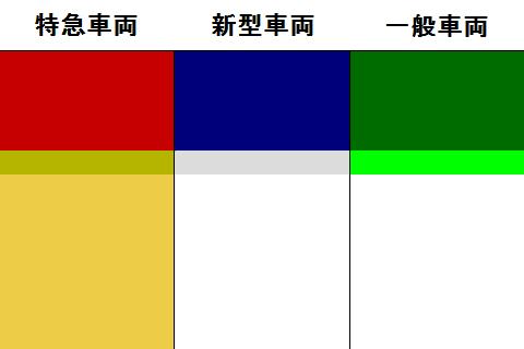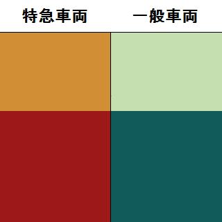 열차 종별은 종별 표시기(행선막)과 선두 차량 전면의 전면 하부 표지등으로 식별 가능하다. 점등 패턴은 다음과 같다.
