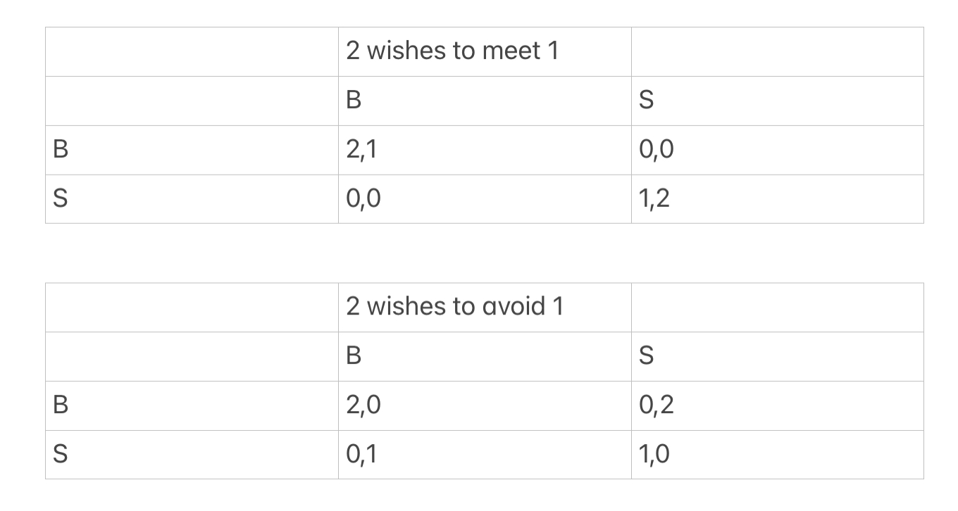 예를 들어, 플레이어 1이 플레이어 2가 자신과 데이트하기를 원하는지 아니면 자신으로부터 멀어지기를 원하는지 확신하지 못하는 반면, 플레이어 2는 플레이어 1의 선호도를 이해한다고 가정해 보자. 플레이어 1이 플레이어 2가 자신과 데이트하기를 원한다고 믿는 확률이 1/2이고 자신으로부터 멀어지기를 원한다고 믿는 확률이 1/2라고 가정한다면, 이 상황의 분석에는 플레이어의 무승부에 대한 선호도를 이해해야 한다.