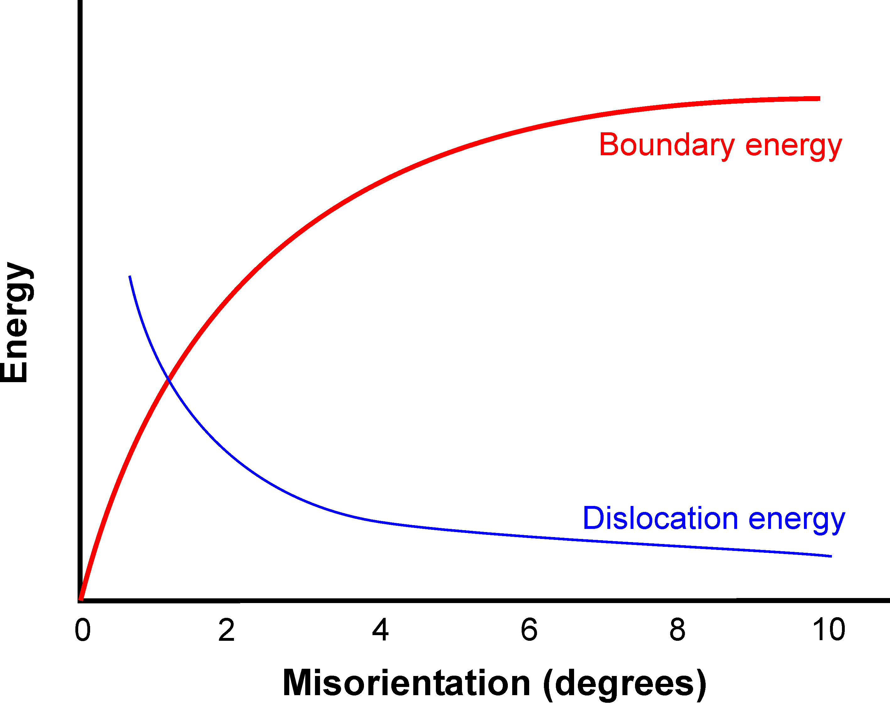 G는 전단 탄성 계수, \nu푸아송 비, r_0는 전위 코어의 반경이다. 이 방정식에 따르면 오정렬 각도(\theta)가 증가함에 따라 경계 에너지(\gamma_s)는 증가하지만, 전위당 에너지는 감소한다. 이는 더 적고 더 크게 오정렬된 경계를 생성하려는 경향, 즉 결정립 성장을 유도하는 원동력이 된다.