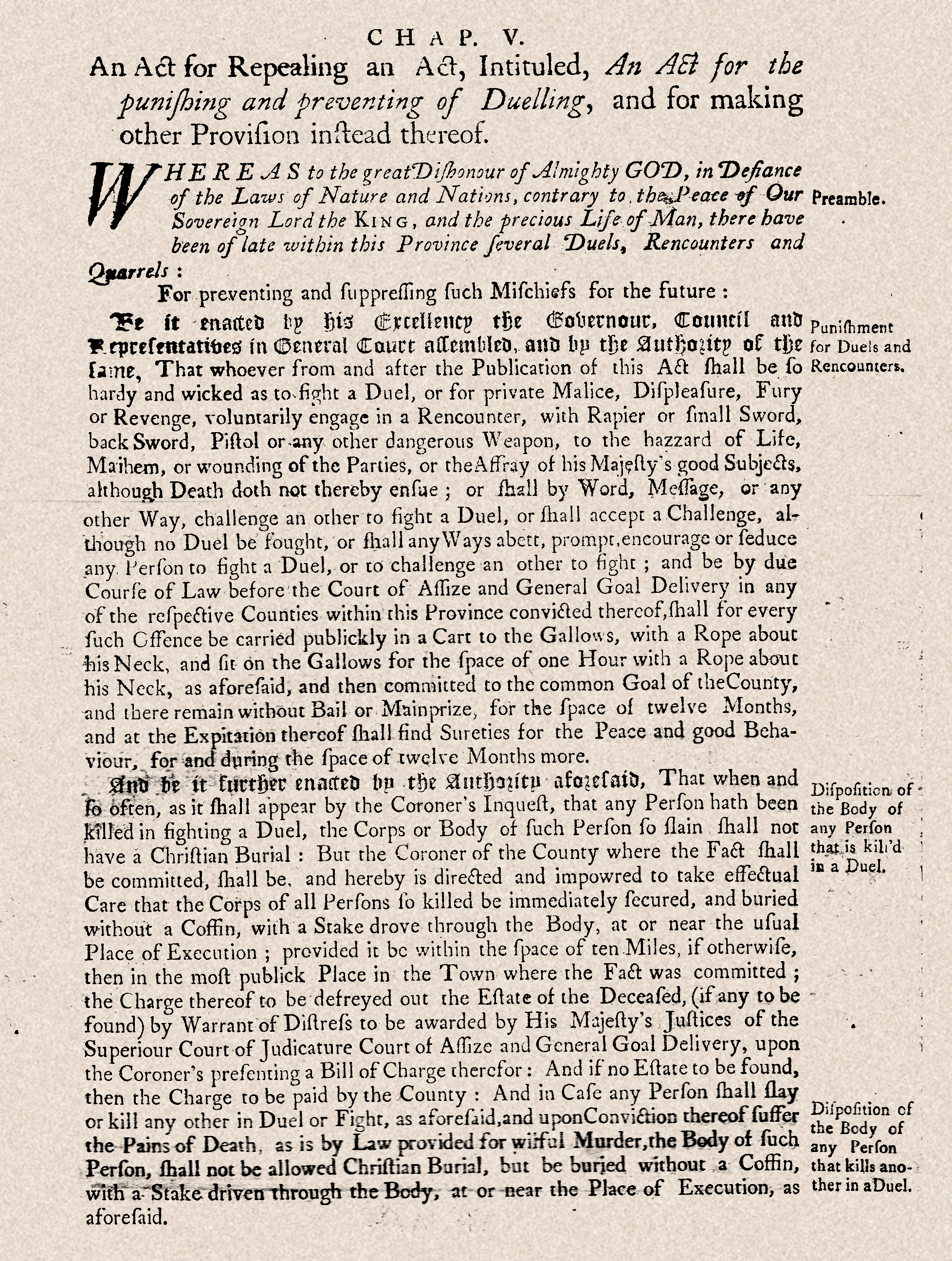 1728년 초부터 일부 미국 주들은 이 관행을 제한하거나 금지하기 시작했다. 1728년 매사추세츠 만 식민지의 결투 처벌 및 방지 법률에 따르면 결투로 다른 사람을 죽인 경우 유죄 판결을 받으면 다음과 같은 처벌을 받았다. "만약 어떤 사람이 앞서 언급한 대로 결투나 싸움에서 다른 사람을 죽이고 유죄 판결을 받으면 고의 살인에 대해 법으로 규정된 사형을 받고, 그러한 사람의 시신은 기독교식 매장이 허용되지 않고 관 없이, 앞서 언급한 집행 장소 부근에 말뚝을 박아 묻는다."[97]