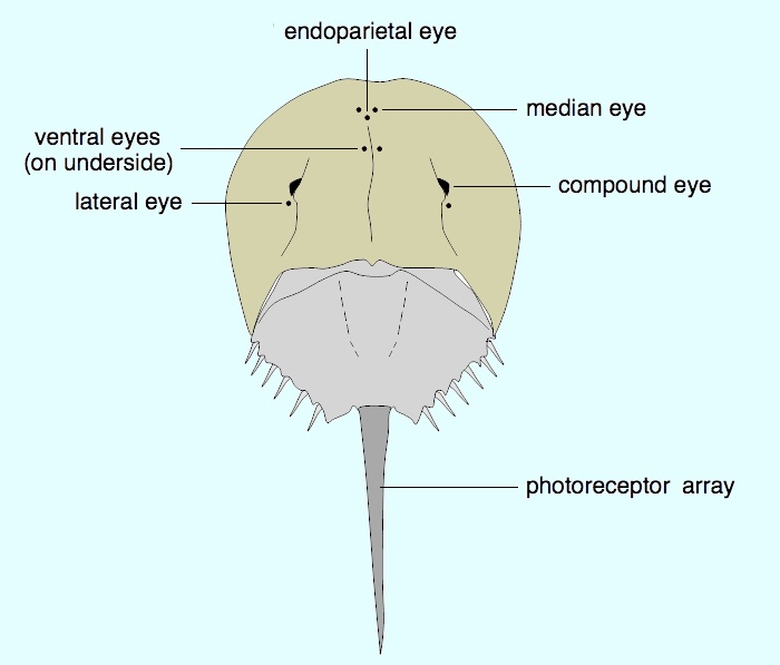 투구게는 머리 측면에 두 개의 큰 겹눈을 가지고 있다. 이 구조물의 뒤쪽에는 추가적인 홑눈이 위치해 있다.[24] 이러한 명확한 구조 외에도, 등딱지의 중앙 앞쪽에 위치한 두 개의 더 작은 홑눈이 있는데, 이는 겉보기에 콧구멍으로 오인될 수 있다.[24] 또 다른 홑눈은 이것들 아래, 등딱지 아랫면에 위치하며, 이 눈은 배아 단계에서 처음에는 쌍으로 존재하다가 나중에 발생 과정에서 융합된다.[24][14] 입 바로 앞에는 또 다른 한 쌍의 홑눈이 위치해 있다.[24] 홑눈은 유기체의 배아 또는 유충 단계에서 중요하며, 성체가 되면 겹눈과 중앙 홑눈이 주된 시각 기관이 된다.[24] 이러한 홑눈은 턱이 있는 동물보다 복잡성이 낮고, 아마도 덜 진화되었을 것이다.[20] 삼엽충의 겹눈과 달리 투구게의 겹눈은 삼각형 모양이며, 밑면에 생성 영역이 있지만 시간이 지남에 따라 길어진다. 따라서 삼각형 꼭짓점에 있는 하나의 낱눈이 유충 유기체의 원래 "눈"이었고, 유기체가 성장함에 따라 후속 행이 추가되었다.[17]