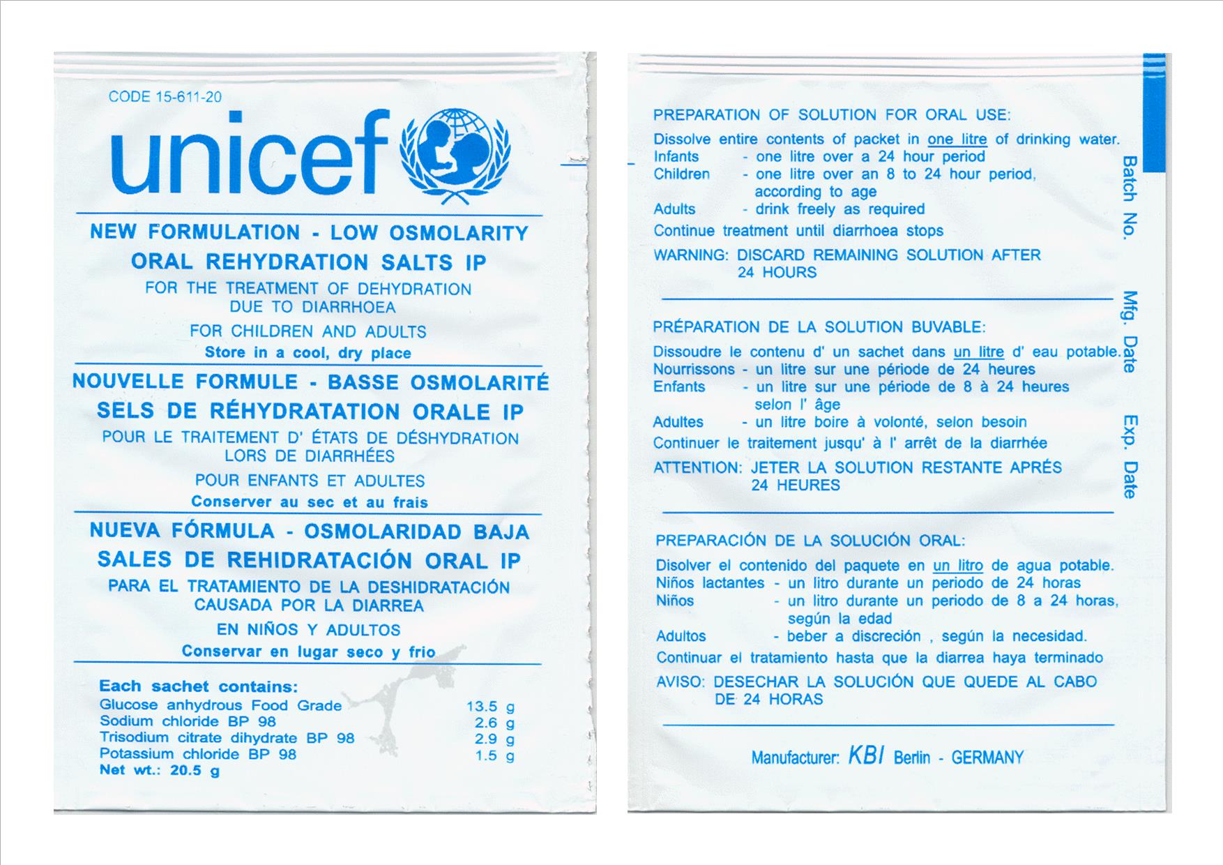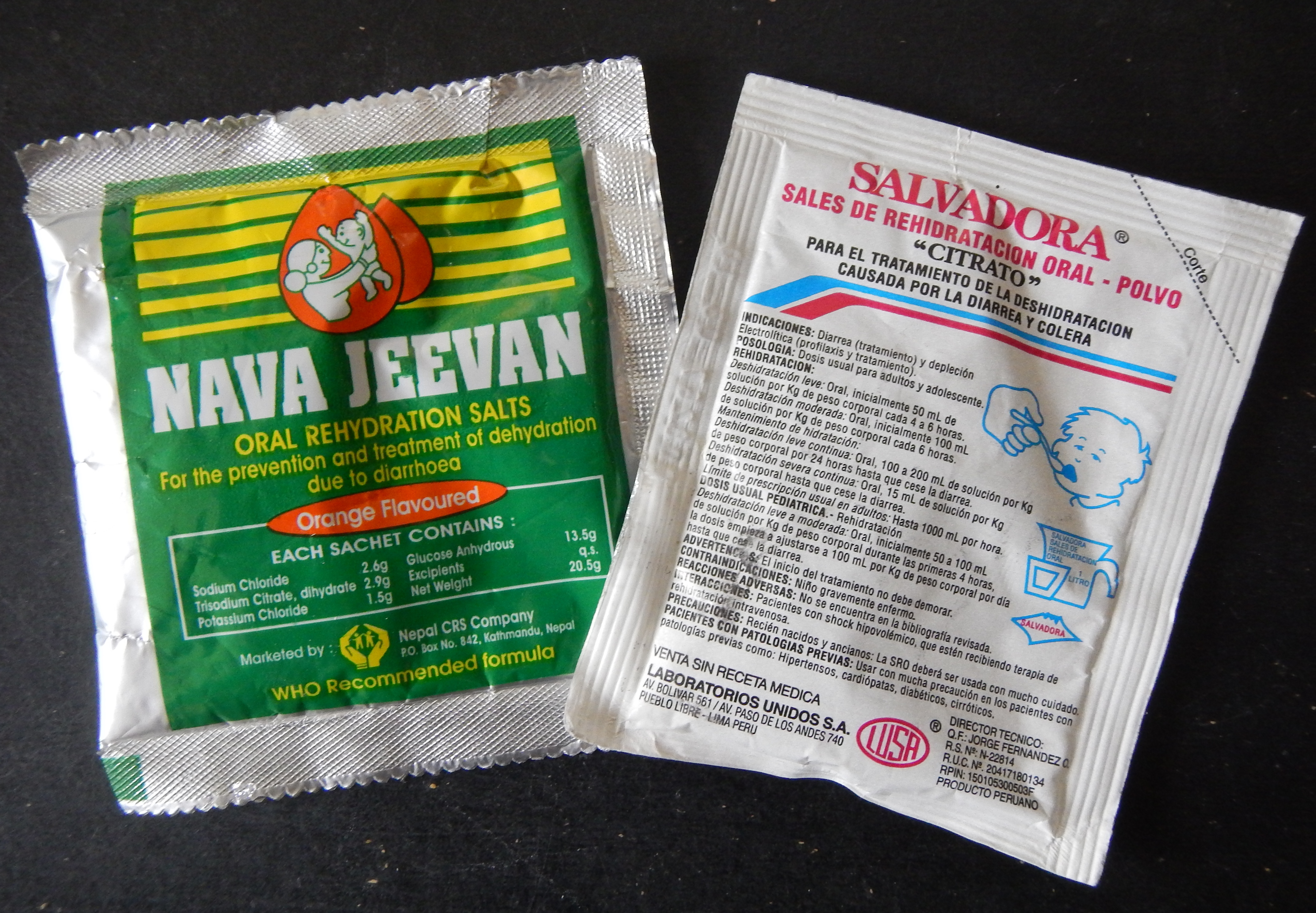 세계 보건 기구(WHO)와 유니세프는 경구 수액 및 경구 수액염(ORS) 제조 지침을 공동 개발했다.[15][16] 상업용 제제는 액체 또는 분말 포장 형태로 판매된다.