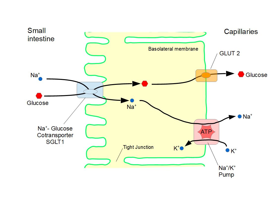 SGLT1 단백질을 통한 포도당의 상피 세포로의 공동 수송에는 나트륨이 필요하다. 두 개의 나트륨 이온과 한 분자의 포도당 (또는 갈락토스)이 SGLT1 단백질을 통해 세포막을 가로질러 함께 수송된다. 포도당이 없으면 장 나트륨은 흡수되지 않는다. 이것이 경구 수액 염에 나트륨과 포도당이 모두 포함된 이유이다. 수송의 각 주기마다 수백 개의 물 분자가 삼투압 평형을 유지하기 위해 상피 세포로 이동한다. 그 결과 나트륨과 물의 흡수는 설사가 계속되는 동안에도 재수화를 달성할 수 있다.[40]