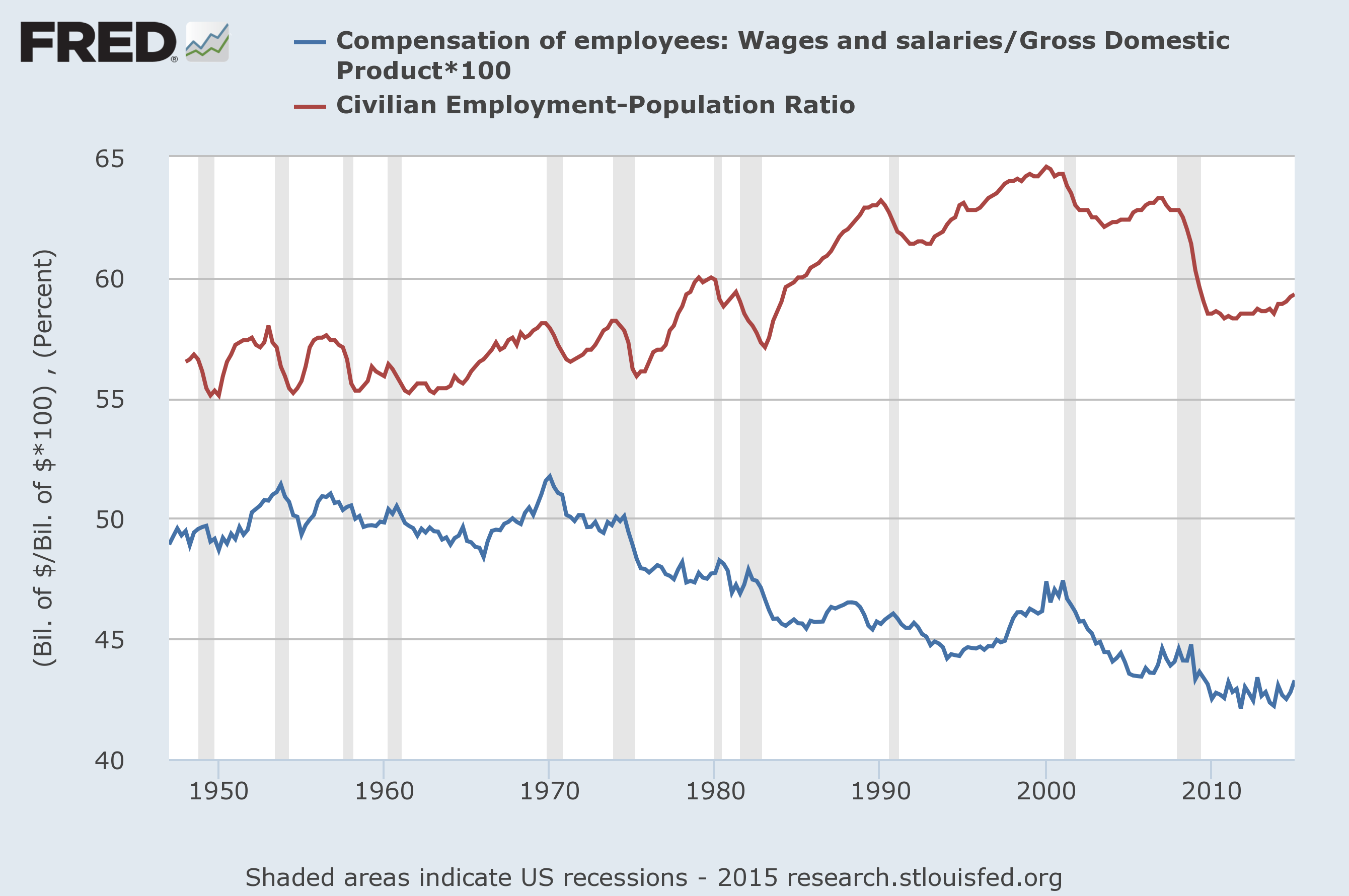 미국에서 경기 순응 지표인 고용률에 비해 경기 역행 지표이자 후행 지표인 임금 분배율