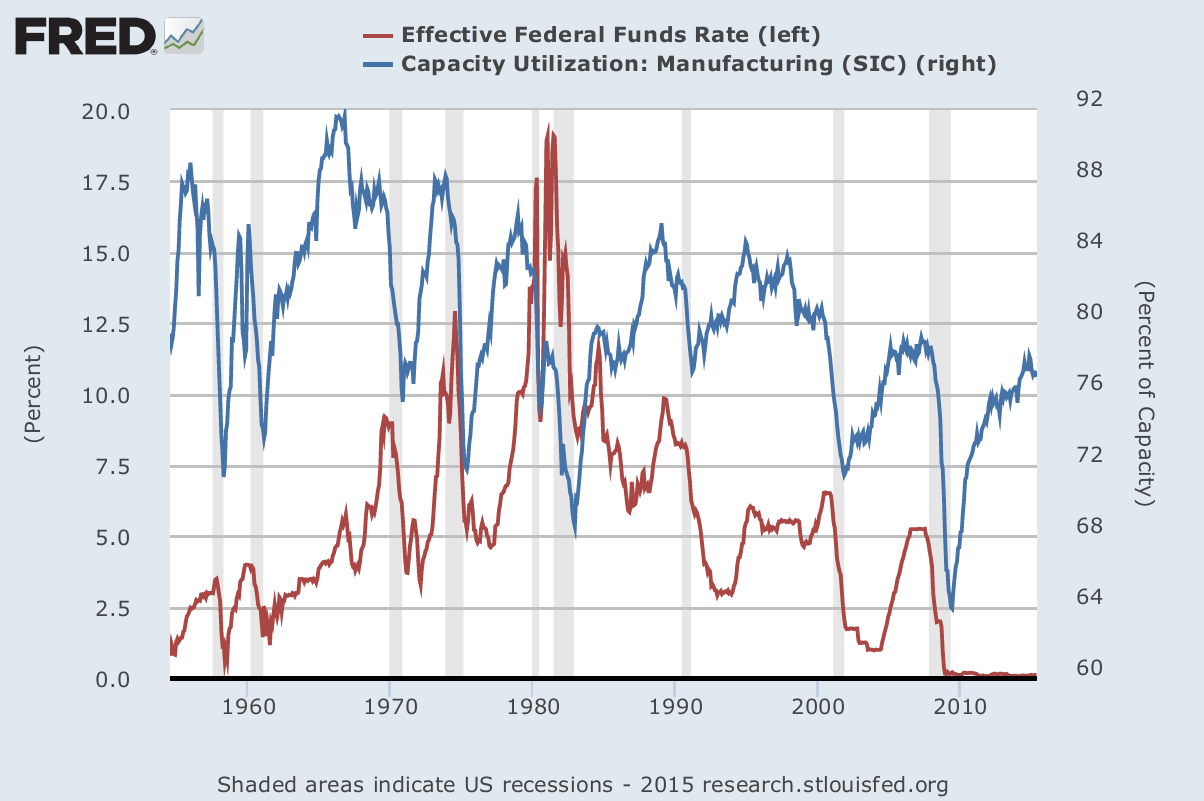 미국 연방 기금 금리는 제조업의 설비 가동률보다 뒤쳐진다.