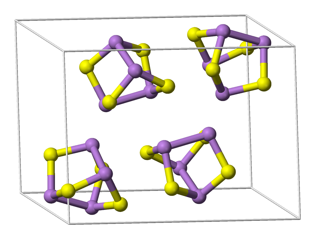 단위 세포의 모습. 단사정계에 속하는 붉은색의 비소-황 광물인 웅황(realgar)의 분자를 명확하게 보여준다.