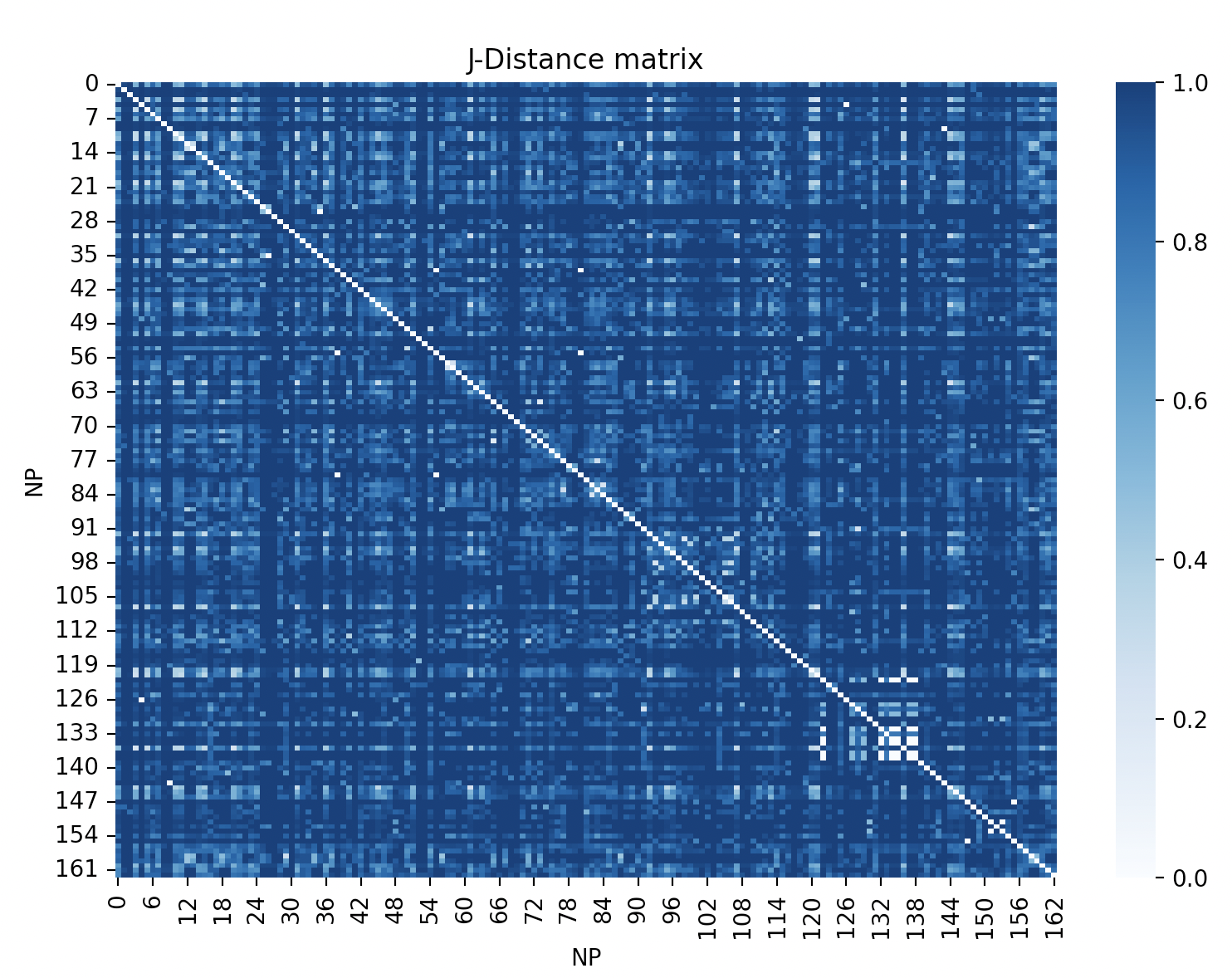 생물학에서 이의 한 가지 예는 게놈의 3차원 매핑에 사용된다. 마우스의 13번 염색체 HIST1 영역에 대한 정보는 유전자 발현 종합 데이터베이스(Gene Expression Omnibus)에서 수집된다.[29] 이 정보에는 특정 게놈 영역에서 나타나는 핵 프로파일에 대한 데이터가 포함되어 있다. 이 정보를 사용하여 자카드 거리를 통해 모든 로커스 간의 정규화된 거리를 찾을 수 있다.