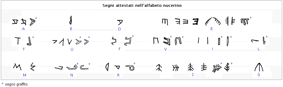 위 표에는 베네티 문자, 팔리스크 문자, 움브리아 문자, 북피케눔 문자, 메사피아 문자, 라이티아 문자, 카무니 문자가 빠져 있다.
