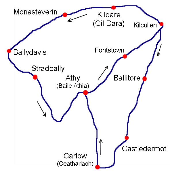 1903년 7월 2일 목요일, 고든 베넷 컵은 아일랜드에서 개최된 최초의 국제 모터 경주였다. 1902년 파리-비엔나 레이스에서 셀윈 엣지(Selwyn Edge)가 네이피어 앤 선(Napier & Son)을 운전하여 우승했기 때문에 영국이 개최국이 되었지만, 영국 국내에서는 공도에서의 레이스가 금지되어 있어[28] 인접국인 아일랜드에서 개최하게 되었다.[17][13][14] ''더블린 모터 뉴스''의 편집자 리처드 J. 메크레디(Richard J. Mecredy)는 킬데어 주(County Kildare)의 한 지역을 제안했고, 현지 법률을 조정하여 '경량 차량(아일랜드) 법안'이 1903년 3월 27일에 통과되었다. 킬데어가 선택된 이유는 도로의 직선성이 안전에 도움이 될 것이라는 점이 부분적으로 작용했다.1901년 파리-보르도 랠리에서 최소 8명이 사망했고, 1903년 5월 24일 파리-마드리드 레이스에서 많은 사망자가 발생하여 보르도에서 중단되는 등 대중의 안전 우려가 컸다. 이러한 우려를 완화하기 위해 1903년 경주는 폐쇄된 코스에서 열렸으며, 군인과 클럽 임원들의 지원을 받은 7,000명의 경찰관이 배치되어 관중을 통제했다.[15][16] 경로는 8자 모양의 두 개의 루프로 구성되었다.