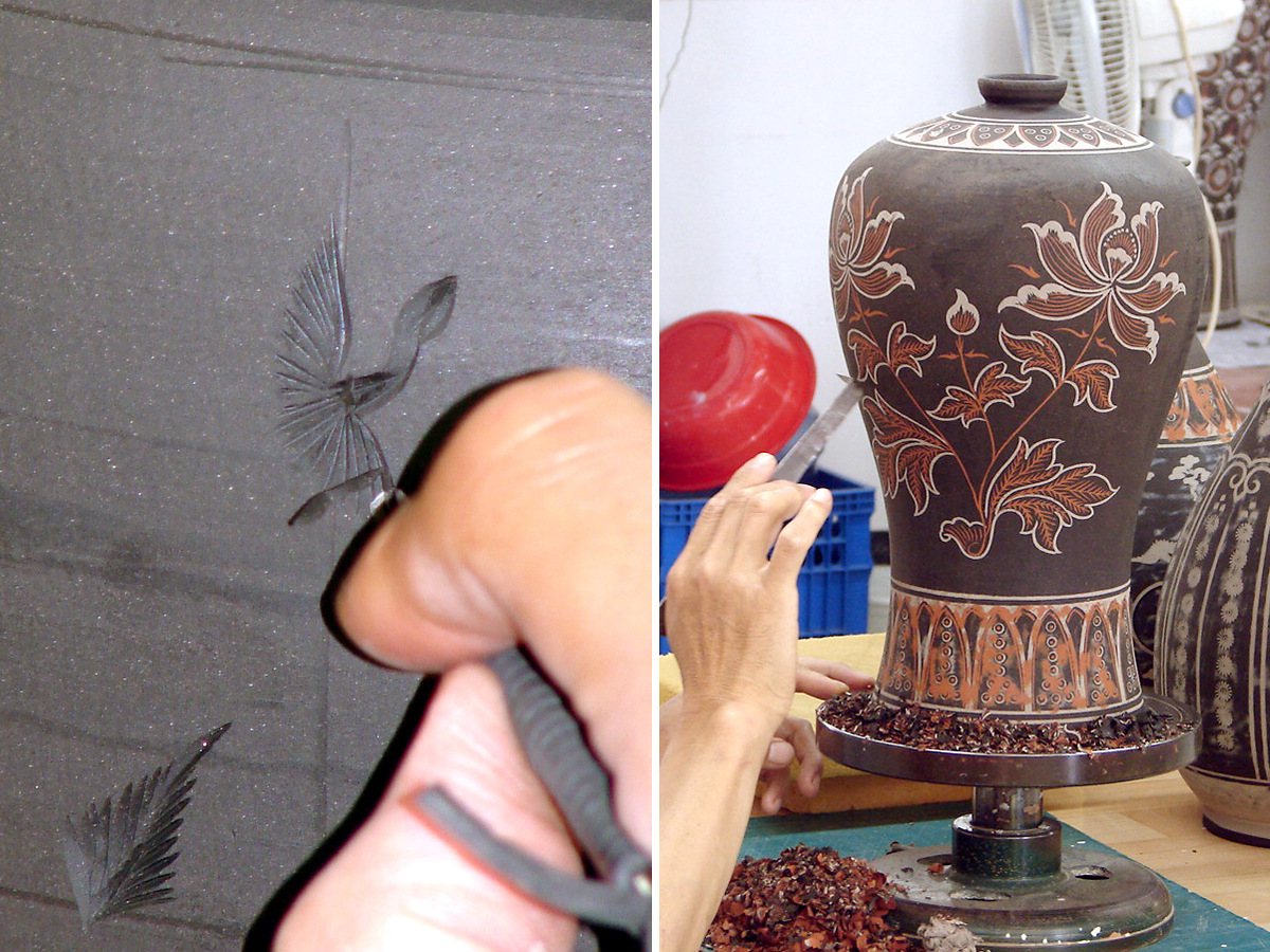 - 밑그림 철사 청자: 청자토로 만든 도자기 전체 표면에 철사 안료를 바른 것이다. 완성된 작품은 검은색과 녹색이 섞여 광택이 난다.[19]