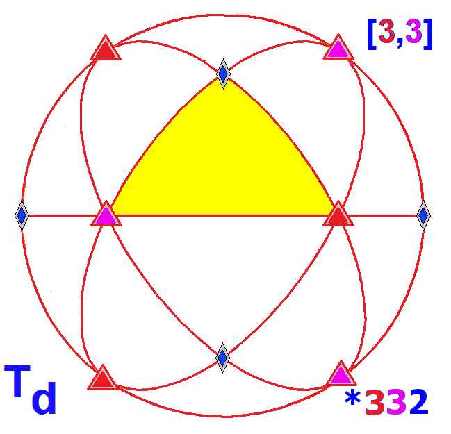 구면에서 정사면체 대칭은 고른 다면체 5개를 만들고, 다듬음 연산을 통해 여섯 번째 형태를 만든다. 정사면체 대칭은 한 꼭짓점은 거울이 두 개 있고, 다른 두 꼭짓점은 거울이 세 개 있는 기본 삼각형 (3 3 2)로 나타난다. 콕서터 군 A2 또는 [3,3]과 콕서터 다이어그램으로도 나타낼 수 있다.