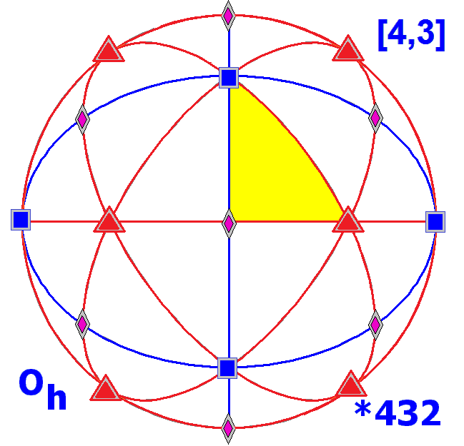 구면에서 정팔면체 대칭은 고른 다면체 7개를 만들고, 교대 연산을 하면 7개를 더 만든다. 이 형태 중 여섯 개는 위에 있는 정사면체 대칭 표의 내용과 중복된다. 정팔면체 대칭은 꼭짓점에 있는 거울 개수로 (4 3 2)인 기본 삼각형으로 나타난다. 콕서터 군으로 B2 또는 [4,3]과 콕서터 다이어그램으로 표시할 수 있다.