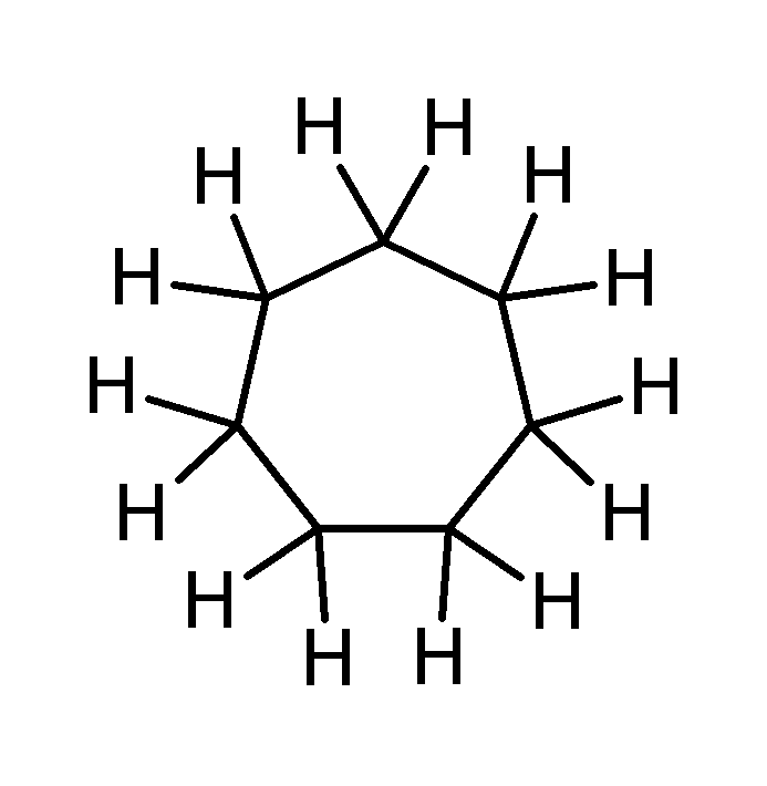 사이클로헵테인, 단순한 7원 탄소 고리 화합물, 메틸렌 수소 표시(비방향족). 벤젠, 6원 탄소 고리 유기 화합물. 메틴 수소 표시, 6개의 전자가 원으로 표시되어 비편재화됨(방향족). ''사이클로''-옥타황, 8원 무기 고리 화합물(비방향족). - --