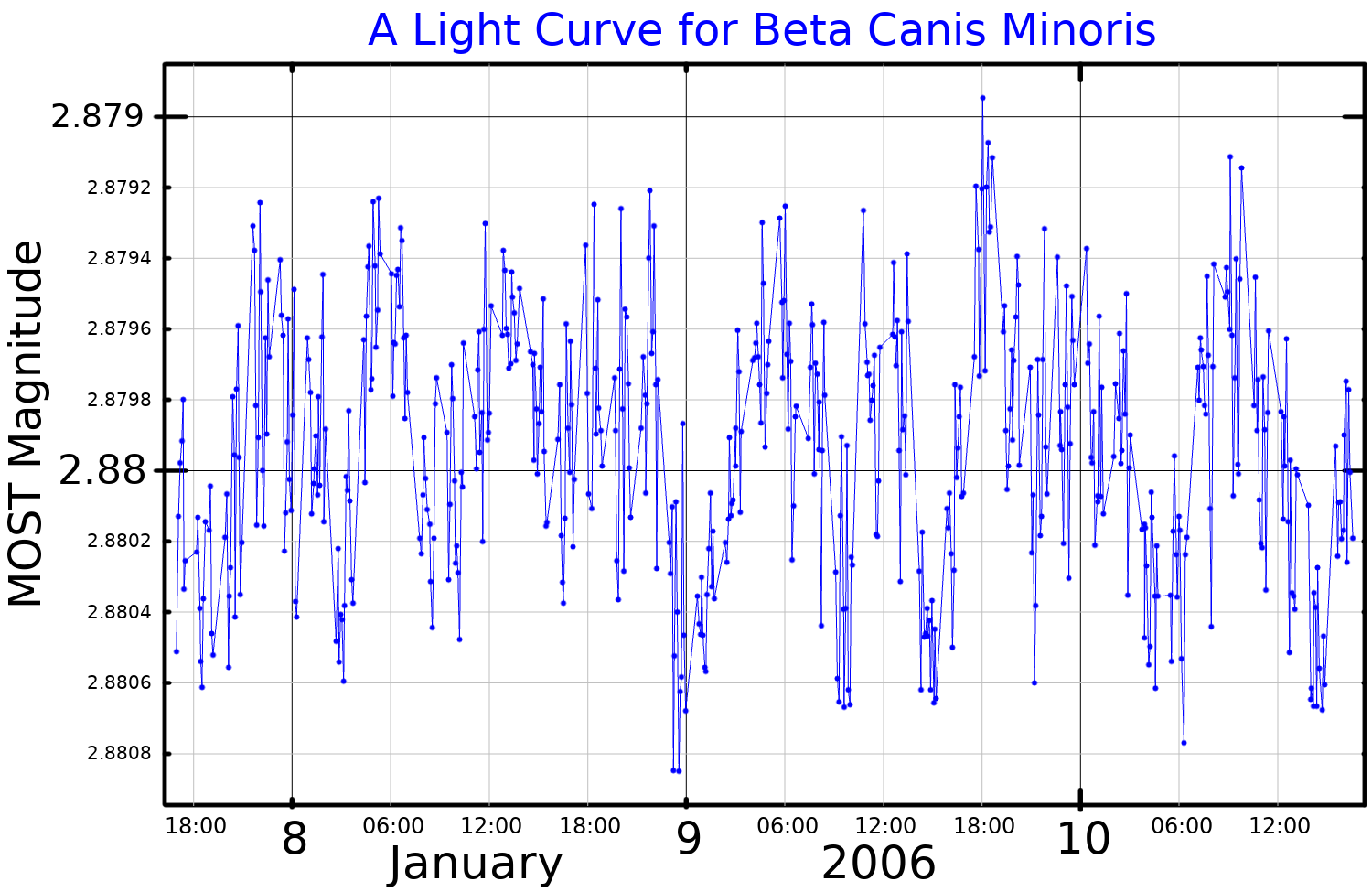 MOST 우주 망원경으로 조사한 결과 β 작은개자리의 밝기가 밀리 등급 수준에서 변화하는 것으로 나타났다. 이 변동은 여러 겹치는 주파수로 형성된 순환 패턴을 가지며, 주요 주파수는 하루 3.257 및 3.282 사이클이다. 따라서 이는 서서히 맥동하는 B형 (SPB) 별의 범주에 속한다. 이러한 유형의 맥동을 보이는 Be 별은 SPBe 별이라고 불린다.