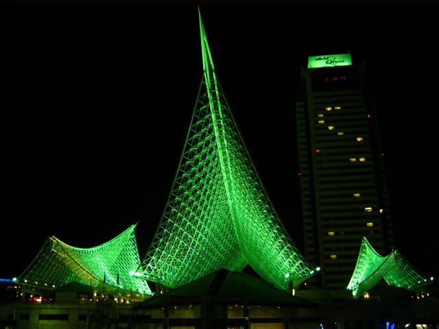 파도 또는 범선의 돛을 연상시키는 독특한 외관의 옥상 구조물은 흰색 프레임으로 되어 있으며, 야간에는 청색 계열의 빛으로 조명된다.