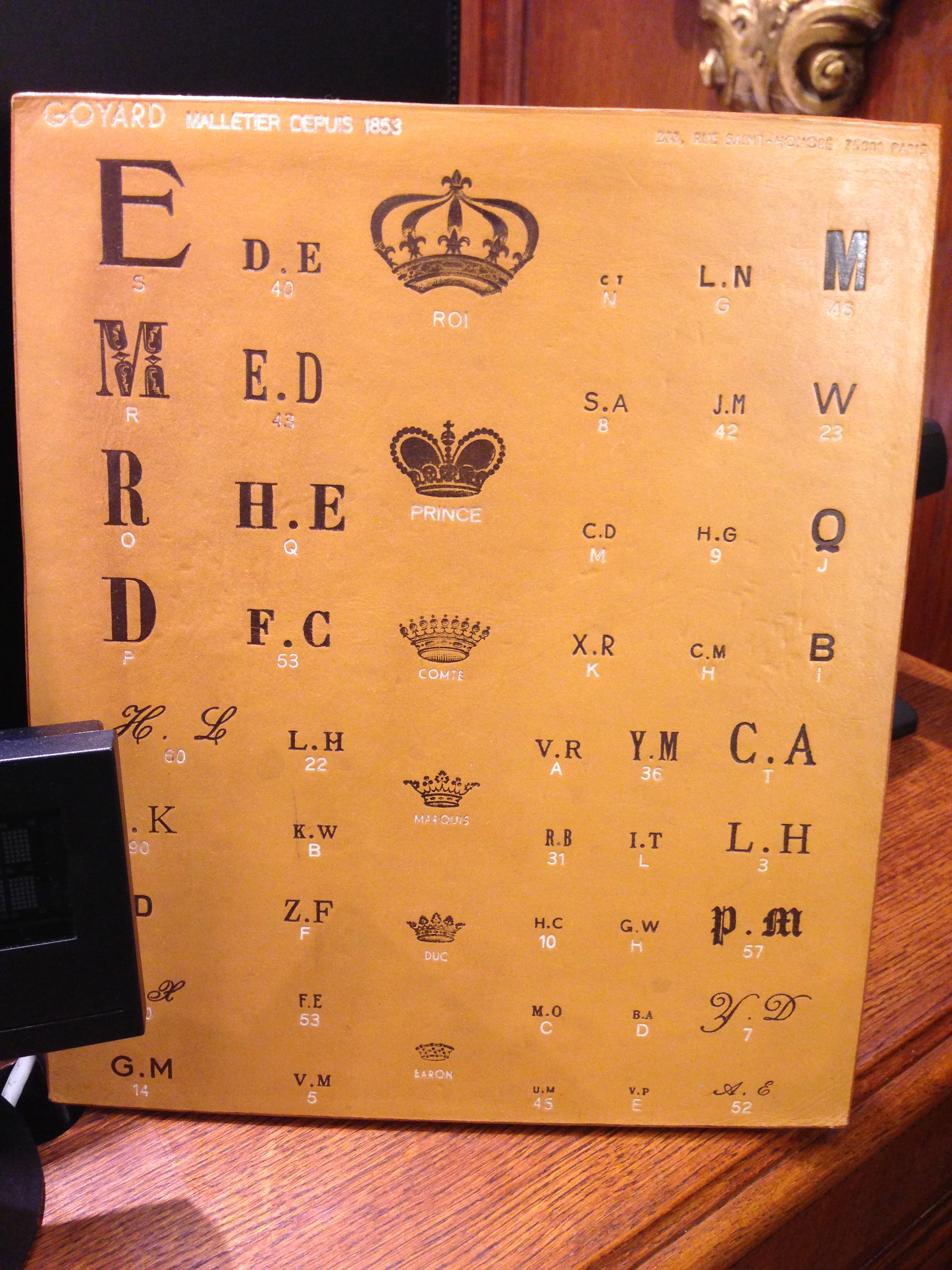 여러 가족 구성원이 함께 여행할 때, 짐 줄무늬가 동일하여 누구의 짐인지 구별하기 어려울 수 있다. 프랑스에서는 전통적으로 각 짐에 소유자의 이니셜을 모노그램으로 새기는 것이 일반적이며, 영국에서는 왕족이든 평민이든 소유자의 전체 이름과 성을 사용하는 것이 관례이다. 이니셜은 오랫동안 사용되어 왔는데, 강가 동료들이 통나무 뗏목에 함께 가지고 다니던 나무 트렁크가 그 증거이다. 그것은 배에 있는 유일한 귀중품이었으며, 강물로부터 음식과 개인 소지품을 보호하는 데 사용되었다. 시간이 지남에 따라 그것은 소유자에게 그가 했던 많은 여행을 상기시키는 기념의 징표가 되었다. 그것은 소유자의 이니셜로 모노그램이 새겨졌고 고용주의 로고가 찍혔다. 프랑수아 고야드의 할아버지는 강가 동료였으며, 가족이 트렁크 제작 사업을 시작하기 오래 전에 모노그램이 새겨진 트렁크를 소유하고 있었다. 줄무늬는 각 가족의 색상으로 칠해진 말 마차와 관련된 오래된 전통을 영속시킨다.