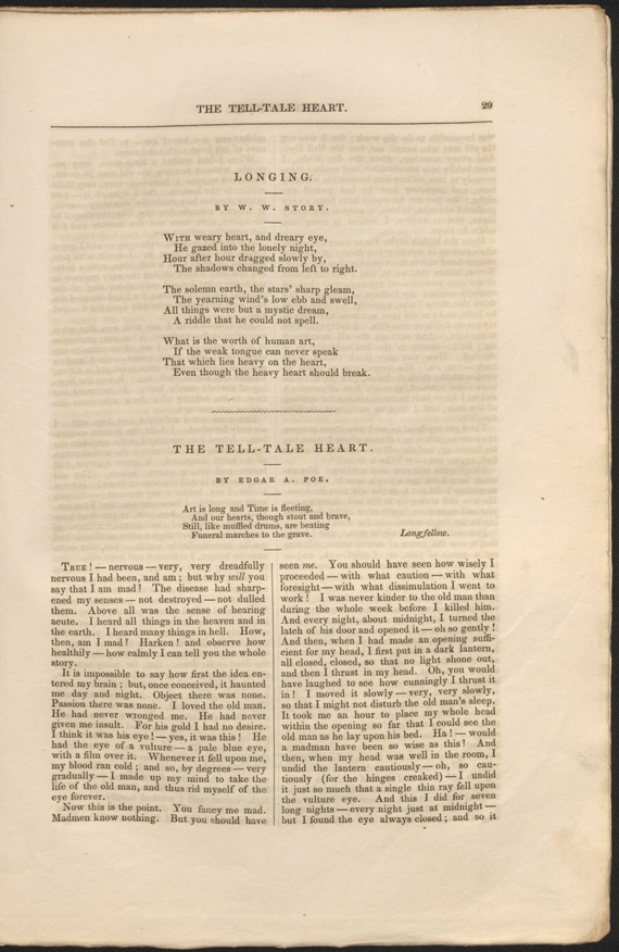 《고자질하는 심장》은 1843년 1월, 제임스 러셀 로웰과 로버트 카터가 편집한 잡지 《The Pioneer: A Literary and Critical Magazine》 창간호에 처음 게재되었다.[2][3] 이 잡지는 보스턴에서는 Leland and Whiting에 의해, 필라델피아에서는 Drew and Scammell에 의해 발행되었다.