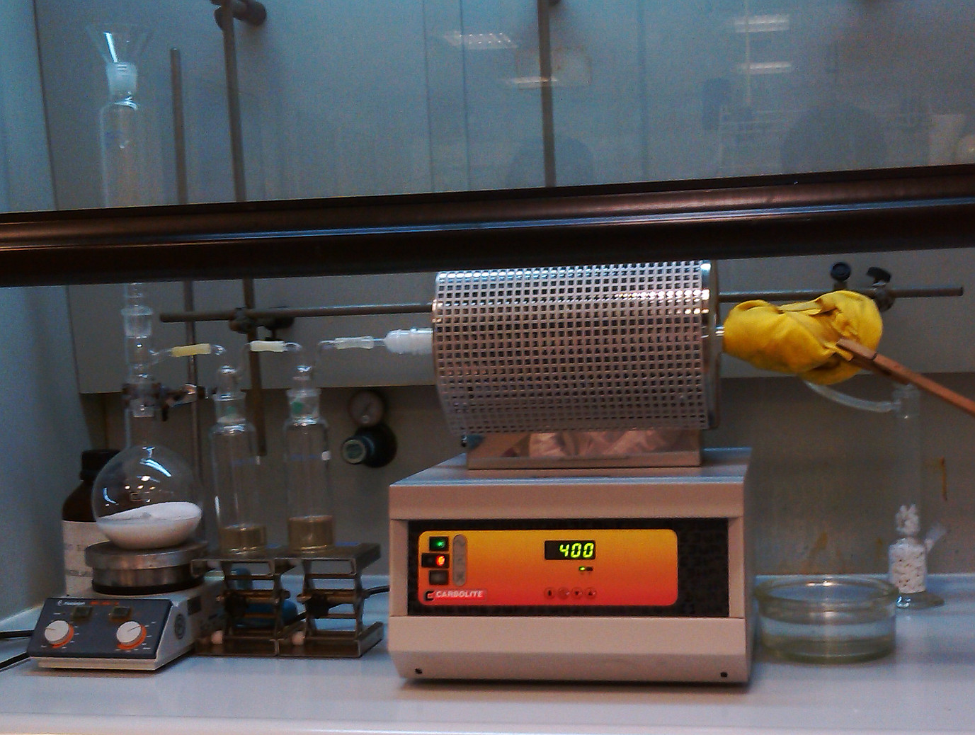 3. 고온 가열: 펠릿을 적절한 용기에 넣고 고온에서 가열한다.[7] 용기의 재질은 반응에 사용하는 전구체, 반응 온도, 그리고 최종적으로 얻고자 하는 생성물의 종류에 따라 신중하게 선택해야 한다.[7] 예를 들어, 금속 산화물을 합성할 때는 주로 실리카나 알루미나 재질의 용기를 사용한다.[7] 가열에는 주로 관형로가 사용되며,[7] 이 장비는 최대 2800°C까지 온도를 높일 수 있다.[9] 일반적인 관형로는 1100°C 정도의 온도에서 반응을 진행시킬 수 있으며, 탄탈관에 전류를 흘려 가열하는 방식의 특수 전기로 같은 장비를 사용하면 2000°C 이상의 더 높은 온도에서도 실험이 가능하다.