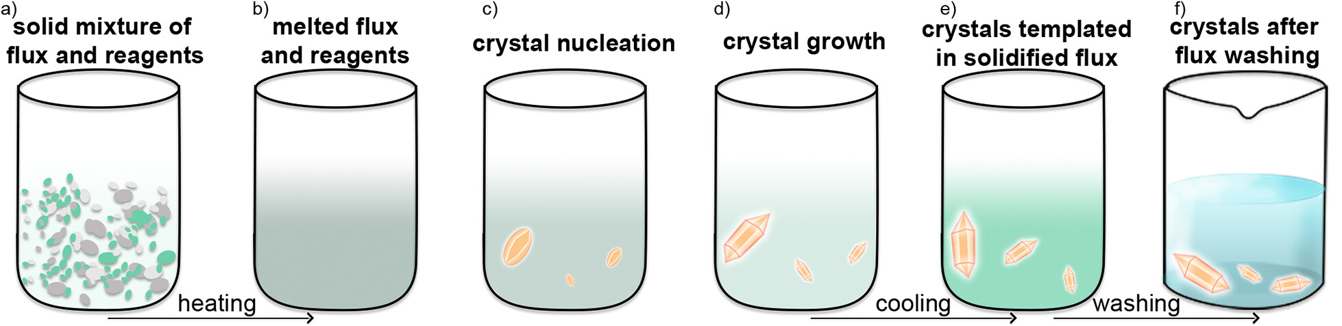 용융 플럭스 합성법은 단결정을 얻는 효율적인 방법 중 하나이다. 이 방법은 출발 시약을 플럭스(flux)와 함께 가열하여 녹이는 방식으로 진행된다. 여기서 플럭스는 출발 물질보다 녹는점이 낮은 불활성 물질로, 용매와 같은 역할을 한다. 반응이 끝난 후, 과량의 플럭스는 적절한 용매로 씻어내거나, 플럭스가 휘발성 화합물일 경우에는 다시 가열하여 승화시켜 제거할 수 있다.