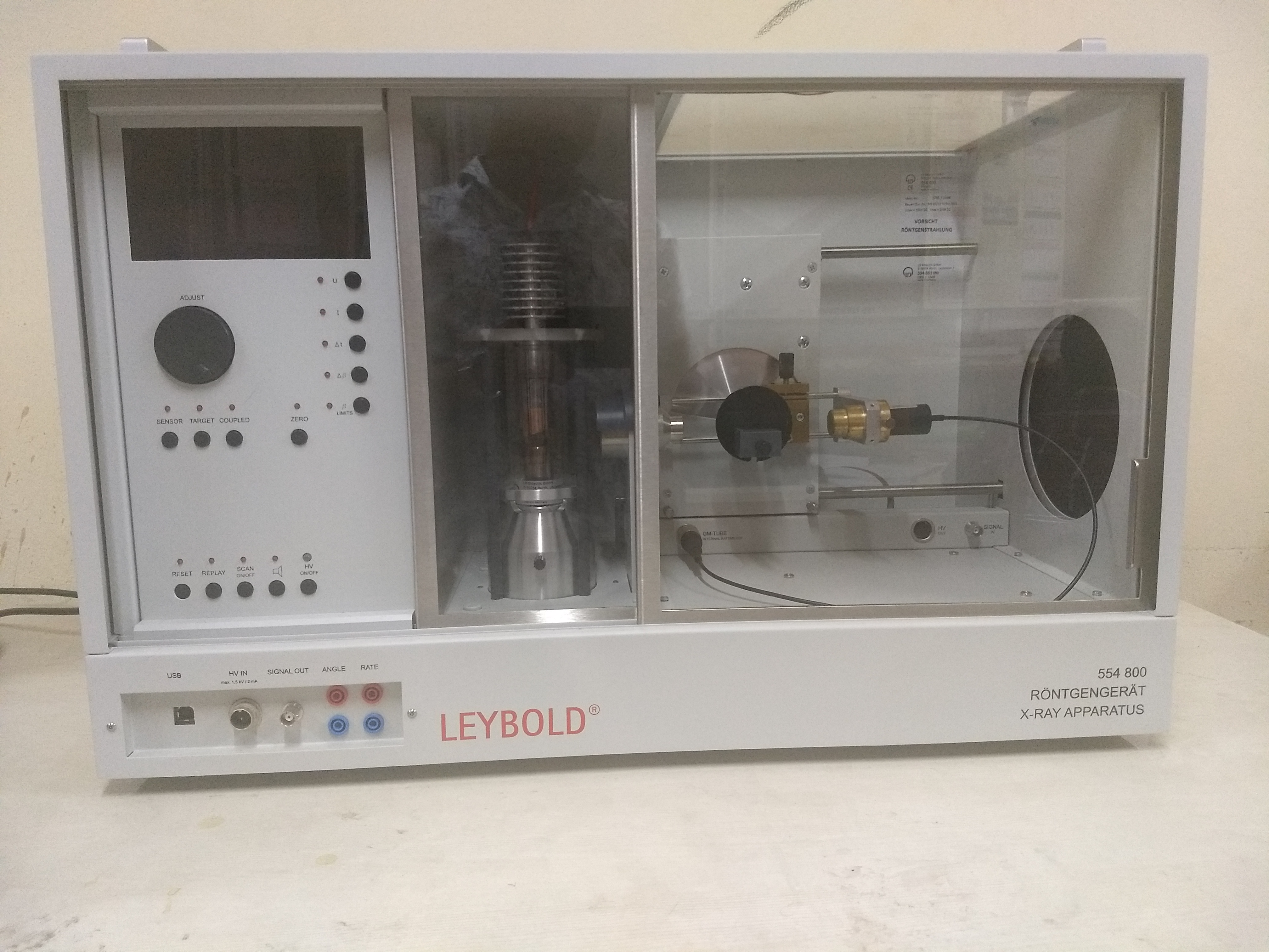X선 회절 분석 (XRD): 재료의 결정상을 확인하는 데 사용되는 X선 회절 분석기(XRD)시료에 X선을 쏘아 특정 각도로 회절되는 X선의 패턴(회절 패턴)을 분석하는 방법이다. 이 패턴은 물질의 결정 구조에 따라 고유하게 나타나므로, 이를 통해 물질이 어떤 결정상으로 이루어져 있는지, 결정 구조는 어떠한지 등의 물리적 특성을 파악할 수 있다.[20] 특히 분말 형태의 시료 분석에 유용하며(분말 회절), 혼합물 내에 알려진 상이 있는지 확인하거나, 새로운 상의 단위격자 크기 및 대칭성 등을 결정하는 데 사용된다.