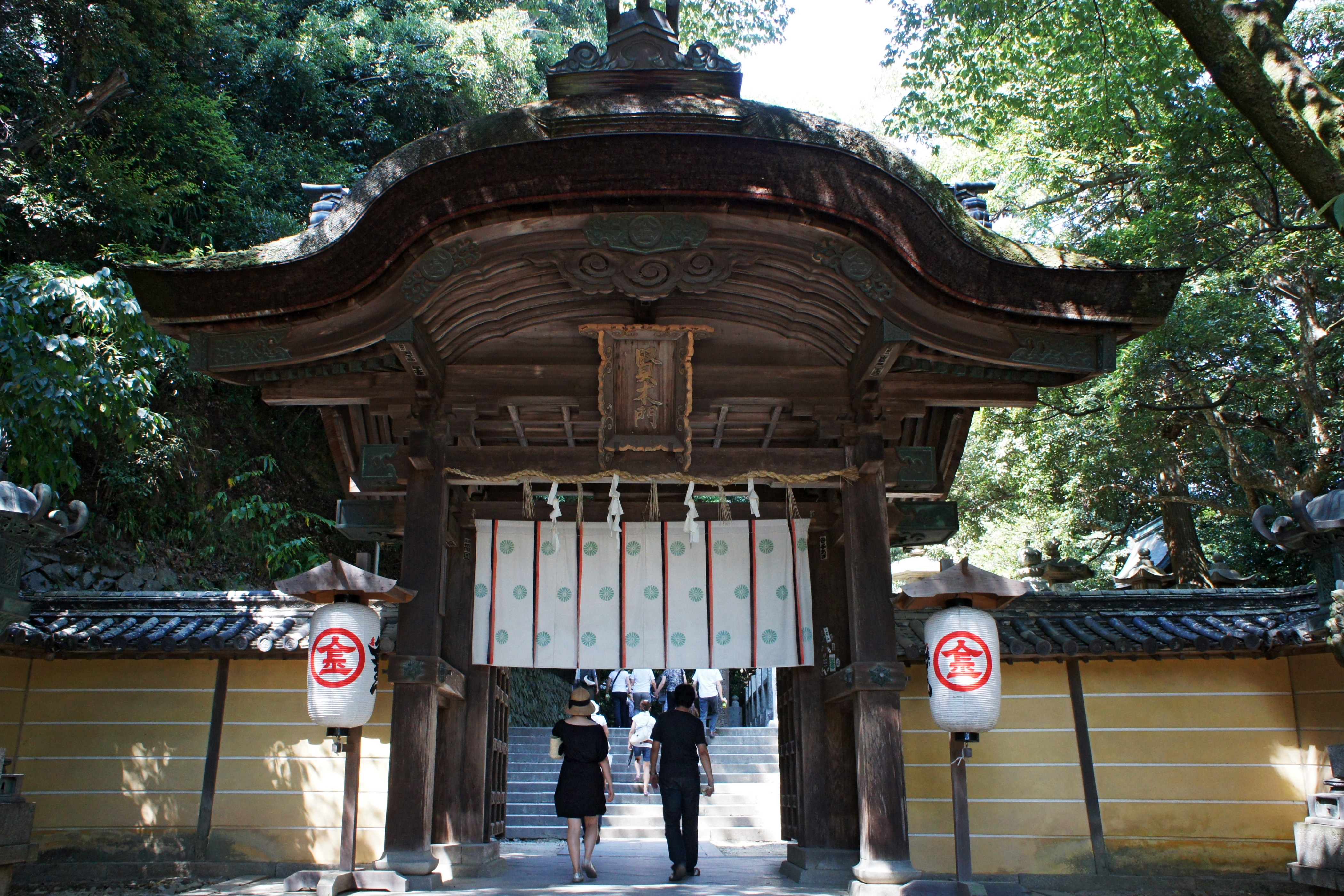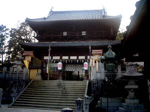 - '''오몬(大門)''' [365단]: 다카마쓰번주 마쓰다이라 요리시게가 1654년경 기증했다. 문을 지나면 가마쿠라 시대부터 경내 영업을 허가받은 "고닌뱌쿠쇼(五人百姓)"[37]가 가미요 아메(加美代飴)를 팔고 있다.