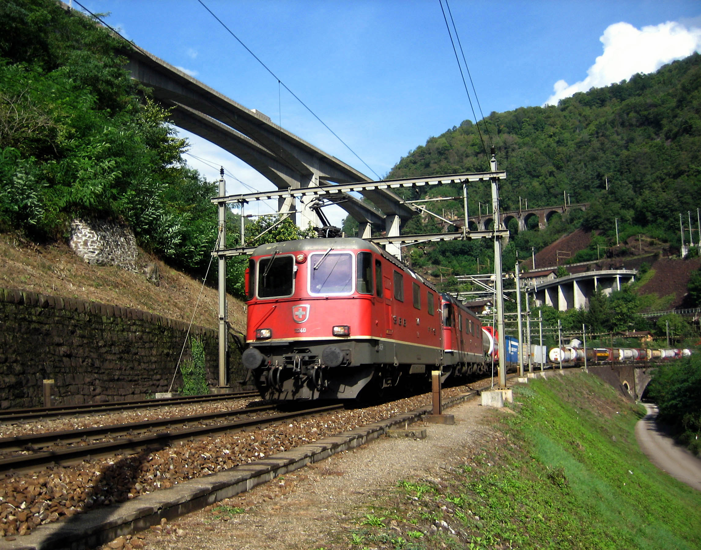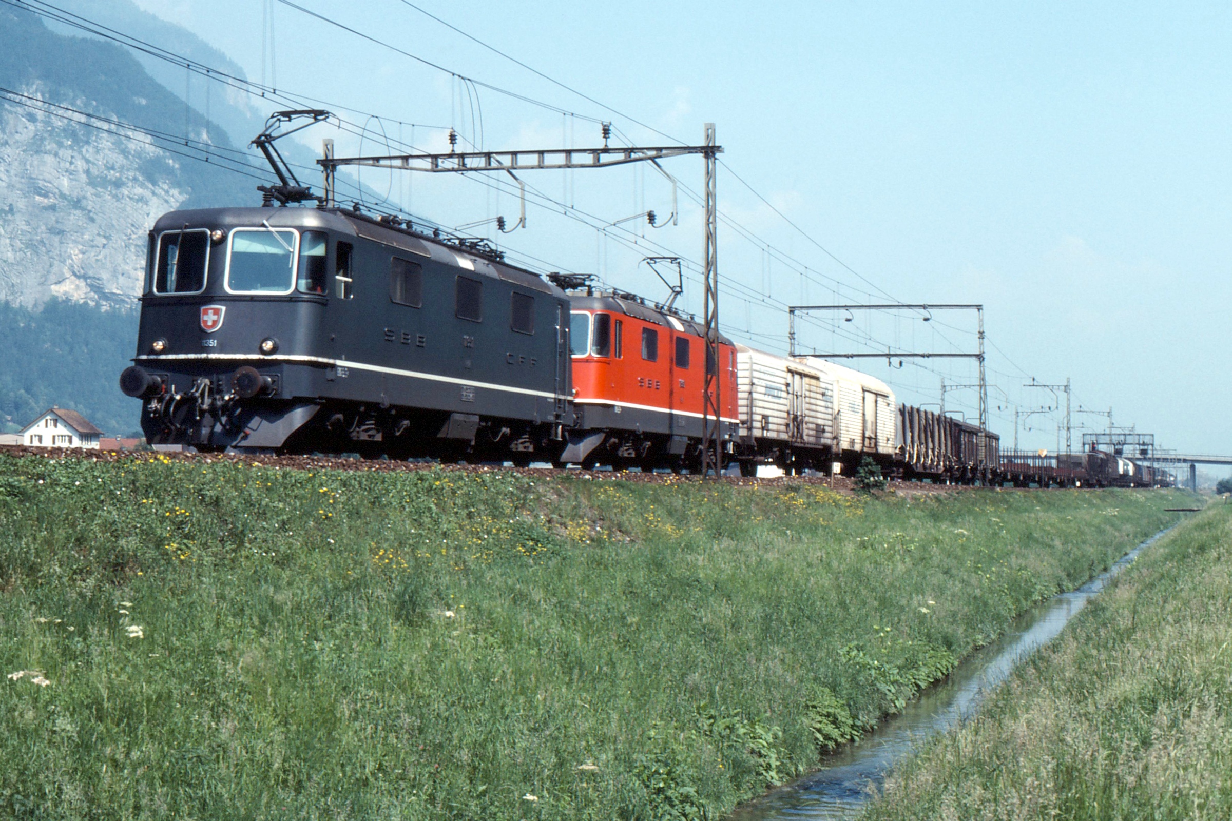 SBB Re 6-6이 SBB Re 4-4을 이끌고 비아스카역 통과